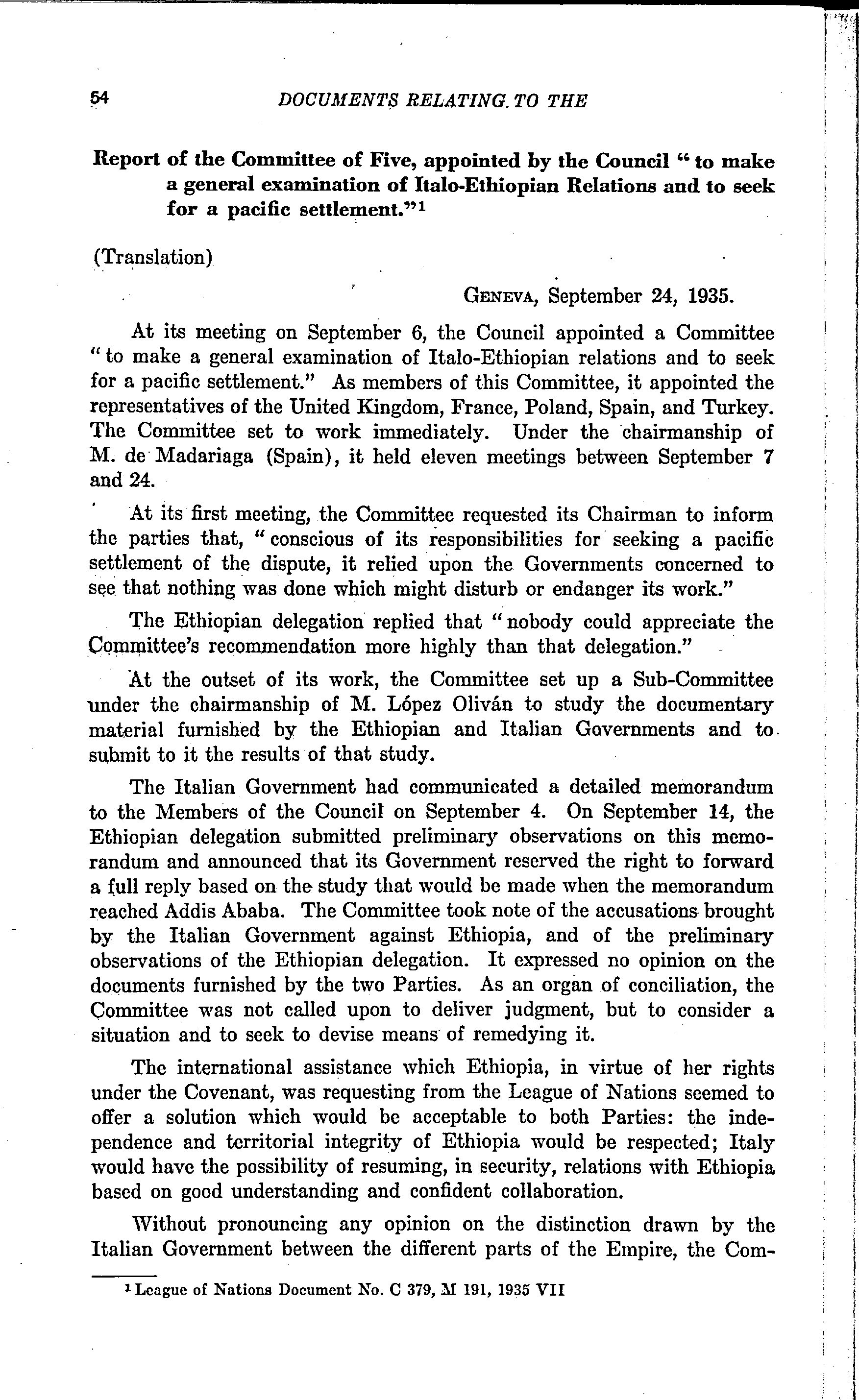 The Council of the League appointed a Committee to make a general examination of Italo-Ethiopian relations and to seek for a pacific settlement.