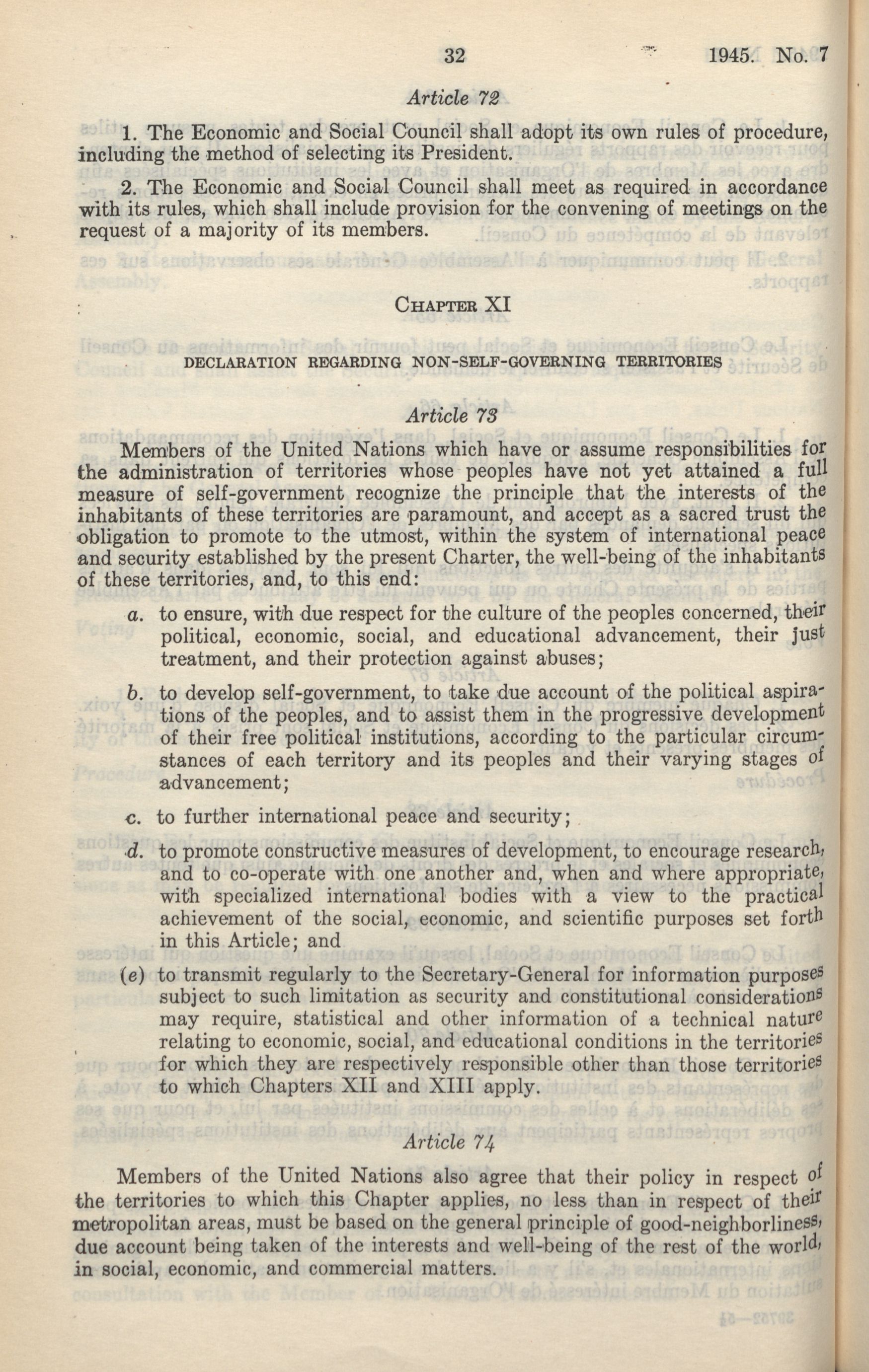 Charter of the United Nations including the Statute of the International Court of Justice together with the interim arrangements establishing the Preparatory Commission of the United Nations signed at San Francisco June 26, 1945 = Charte des Nations unies comprenant le Statut de la Cour internationale de justice suivie des arrangements provisoires établissant la Commission préparatoire des Nations unies signés à San Francisco le 26 juin 1945.