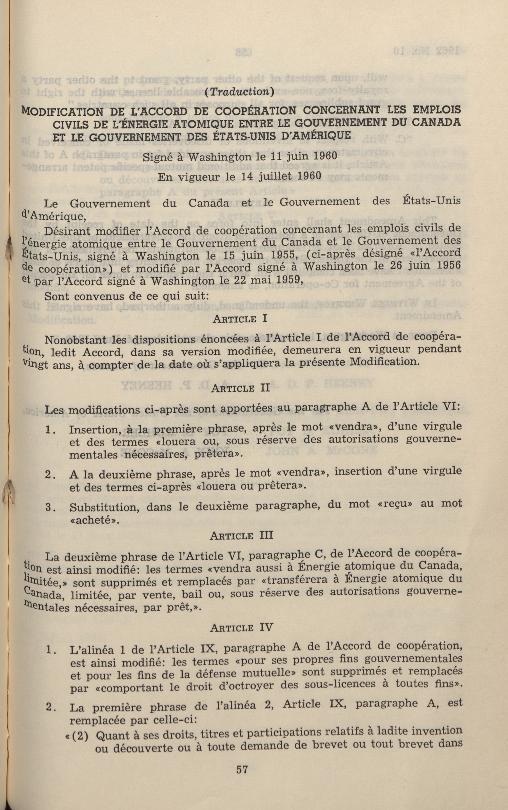 Atomic energy : co-operation in civil uses of atomic energy : amendment to the Agreement of June 15, 1955 between Canada and the United States of America = L'énergie atomique : coopération concernant les emplois civils : modificiation de l'Accord du 15 juin 1955 entre le Canada et les États-Unis d'Amérique. - Adresse bibliographique