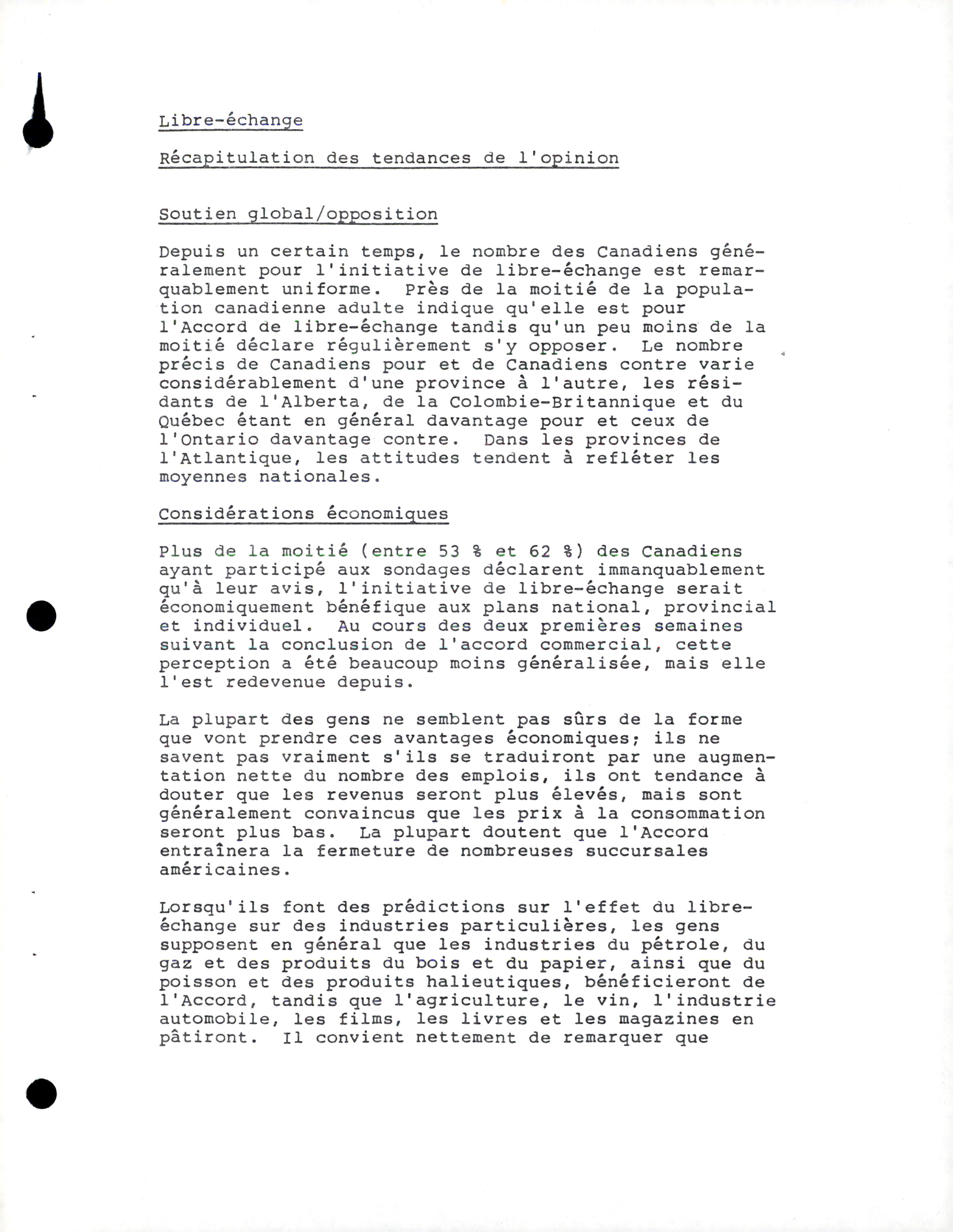 Rapport au Ministère des affaires extérieures sur les attitudes à l'égard de l'Accord de libre-échange Canada-E.-U. 1987-10