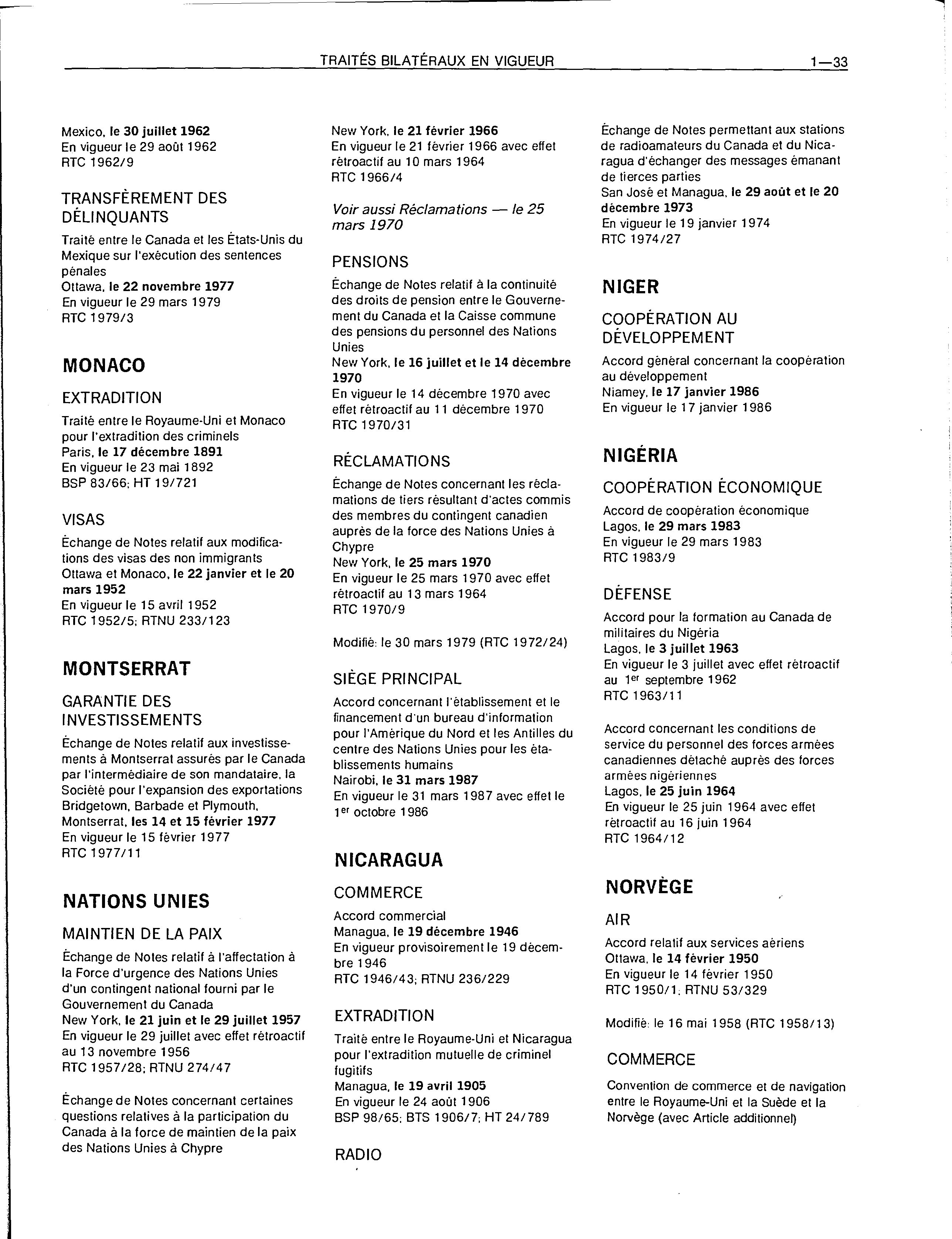 Traités en vigeur : liste des traités bilatéraux et multilatéraux du Canada en vigeur au 1er janvier 1988.
