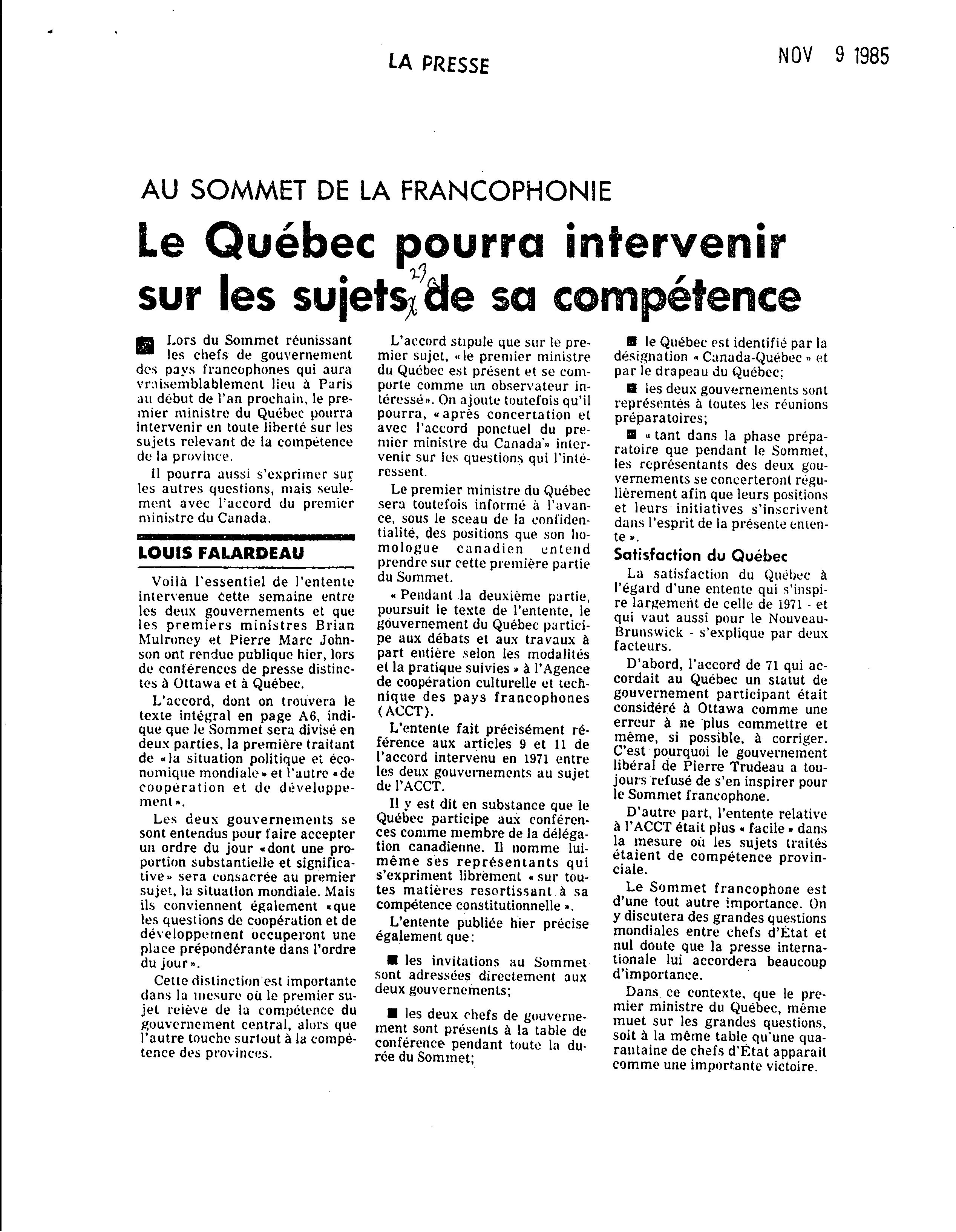 - Le Sommet francophone Paris du 17 au 19 février 1986 = The Francophone Summit Paris February 17 to 19, 1986. Press review (Feb. 17/19 1986)