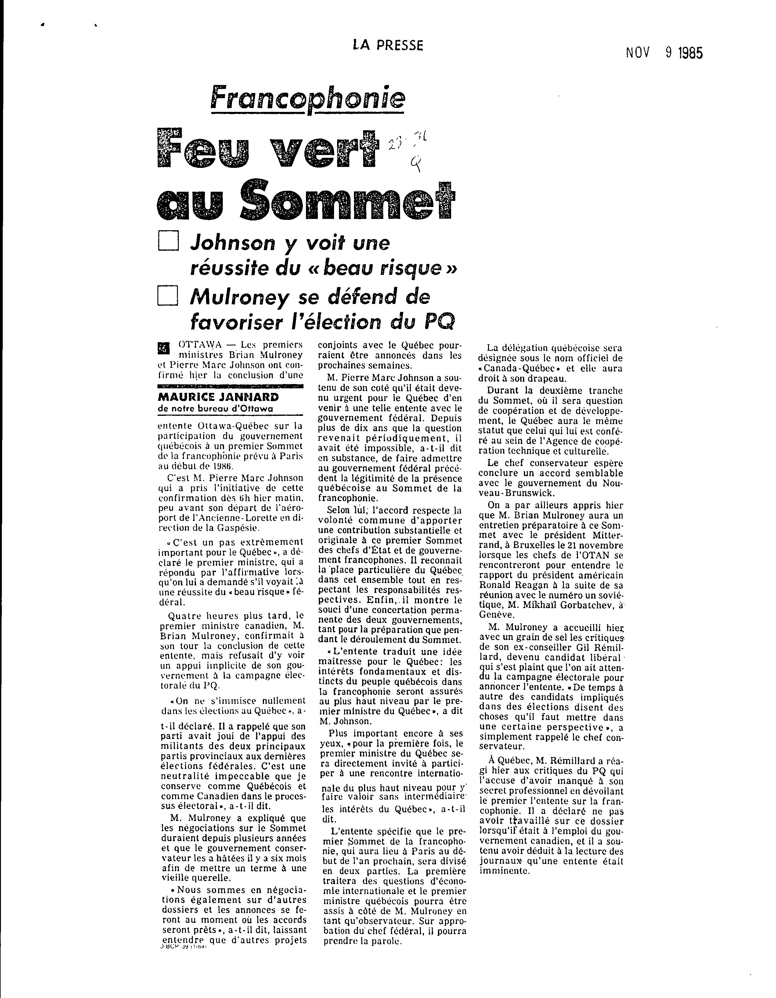 - Le Sommet francophone Paris du 17 au 19 février 1986 = The Francophone Summit Paris February 17 to 19, 1986. Press review (Feb. 17/19 1986)