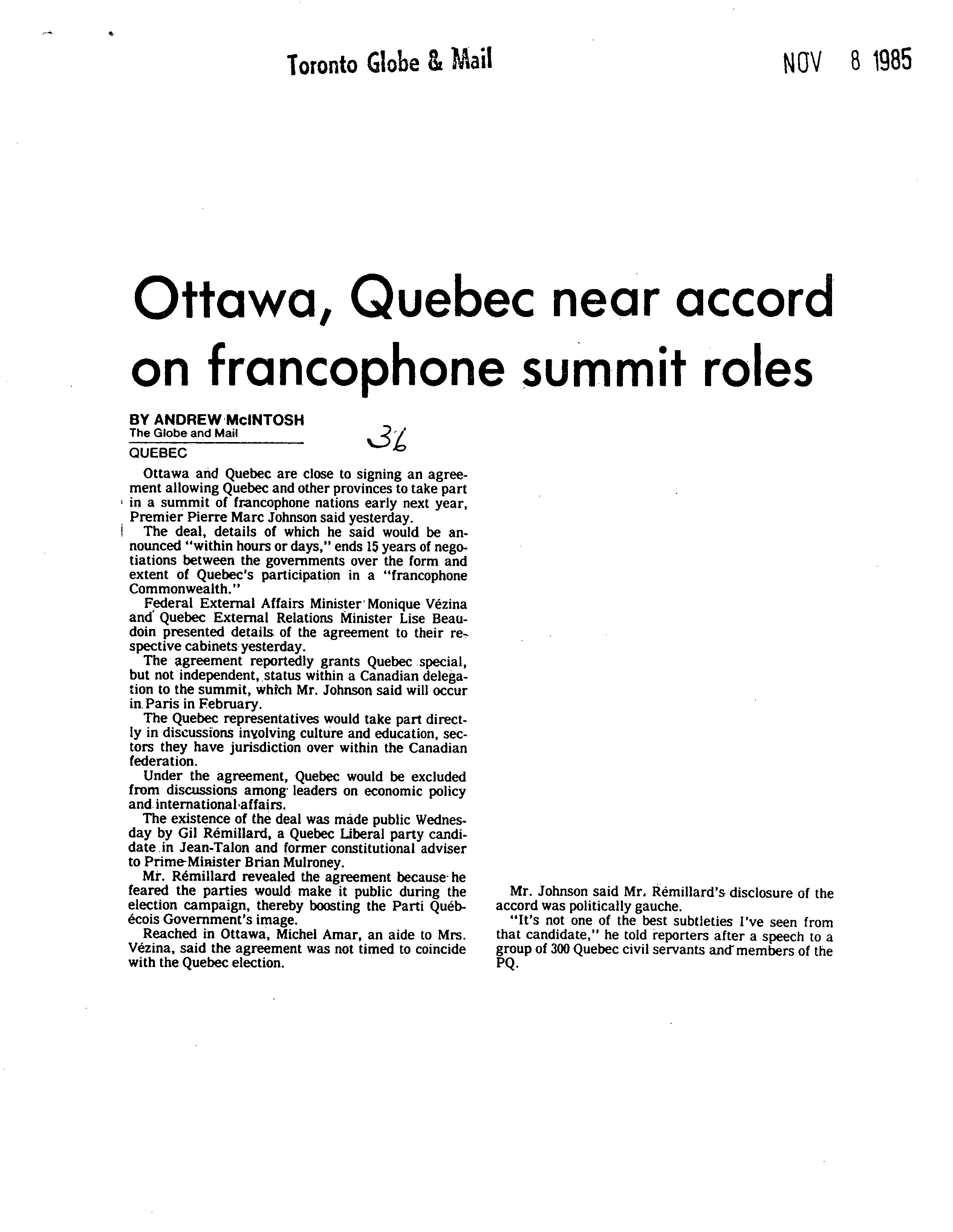 - Le Sommet francophone Paris du 17 au 19 février 1986 = The Francophone Summit Paris February 17 to 19, 1986. Press review (Feb. 17/19 1986)