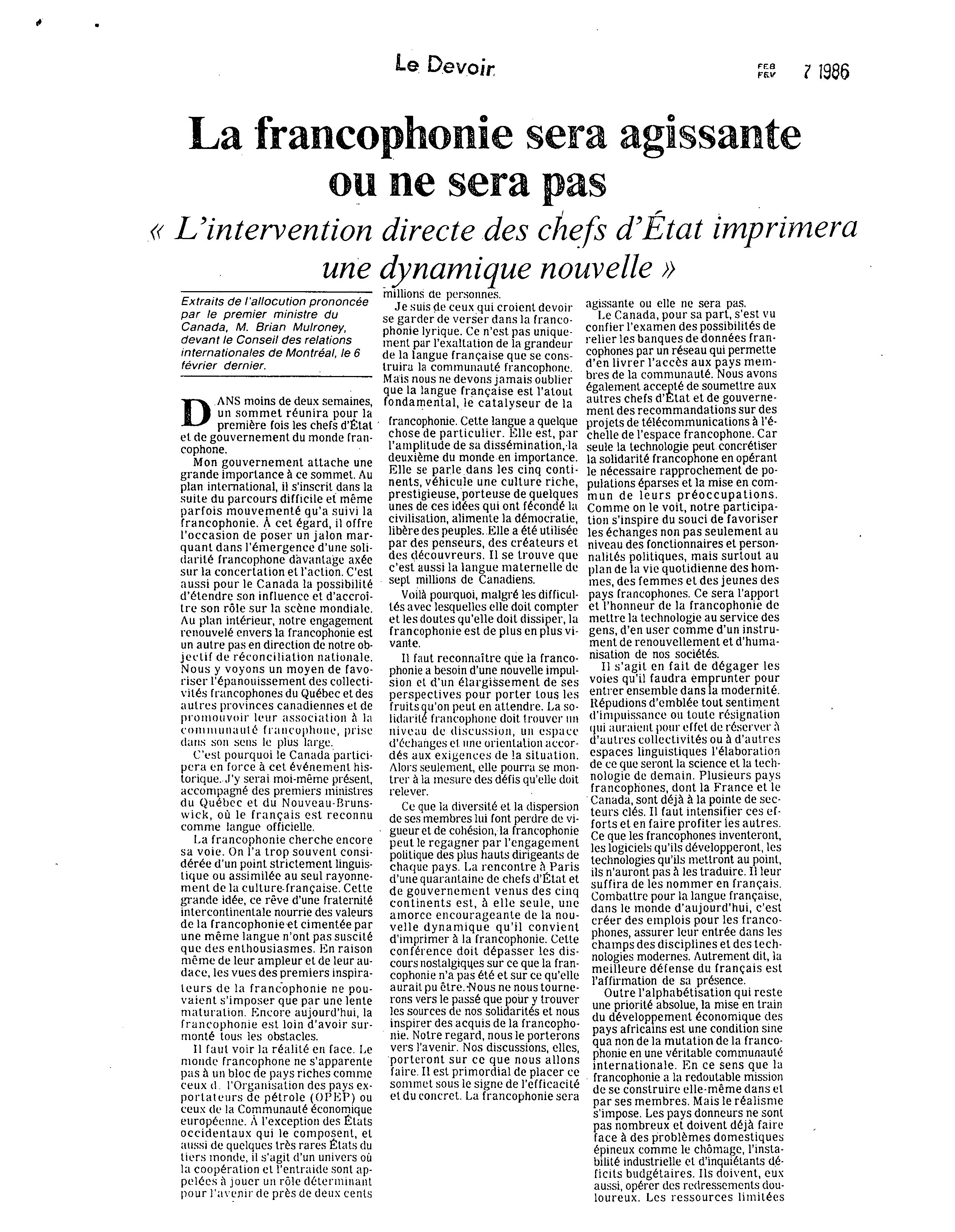 - Le Sommet francophone Paris du 17 au 19 février 1986 = The Francophone Summit Paris February 17 to 19, 1986. Press review (Feb. 17/19 1986)