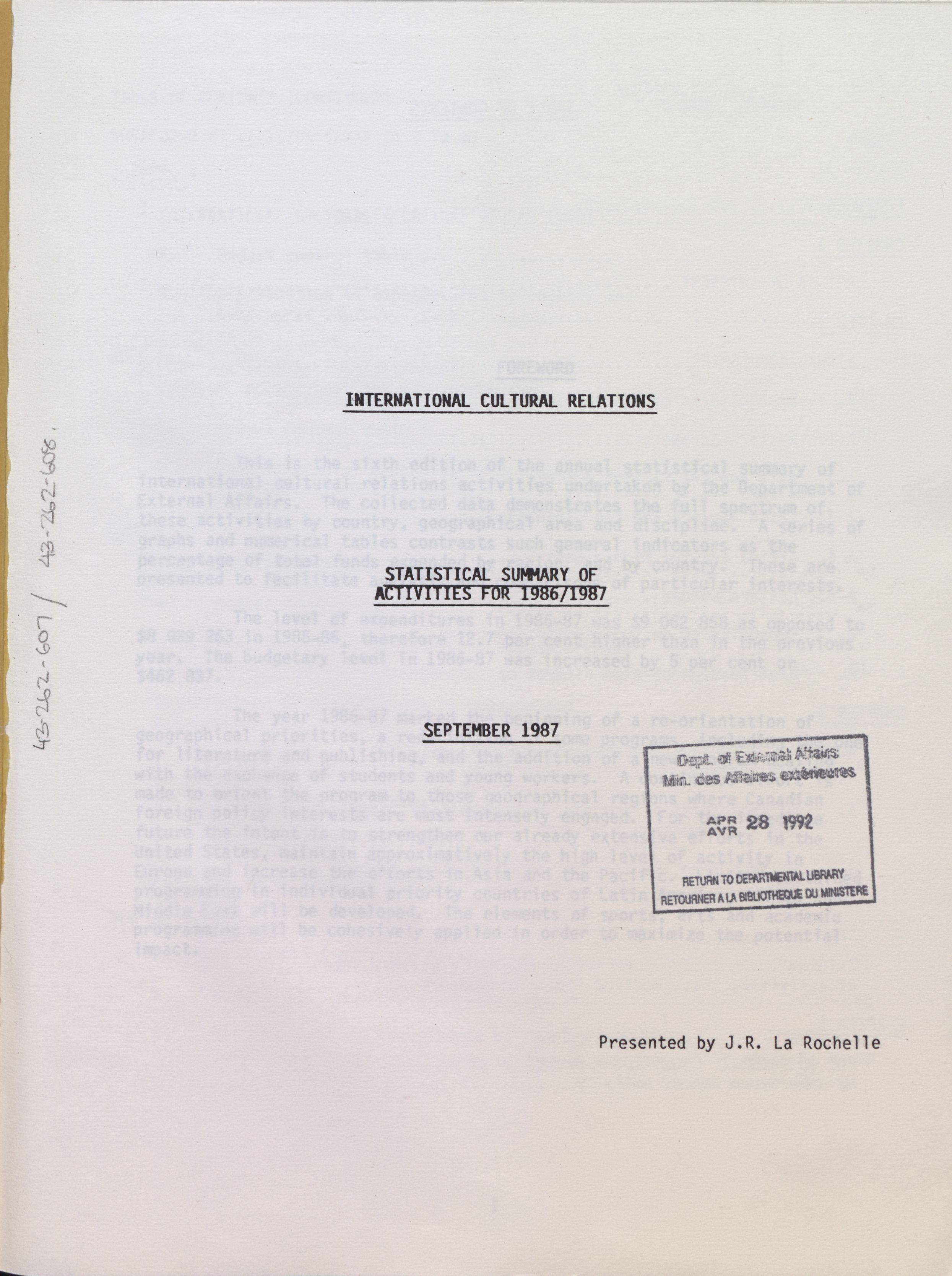 Relations culturelles internationales : bilan "chiffré" des activités ... / Ministère des affaires extérieures Canada. -- : 1986/87