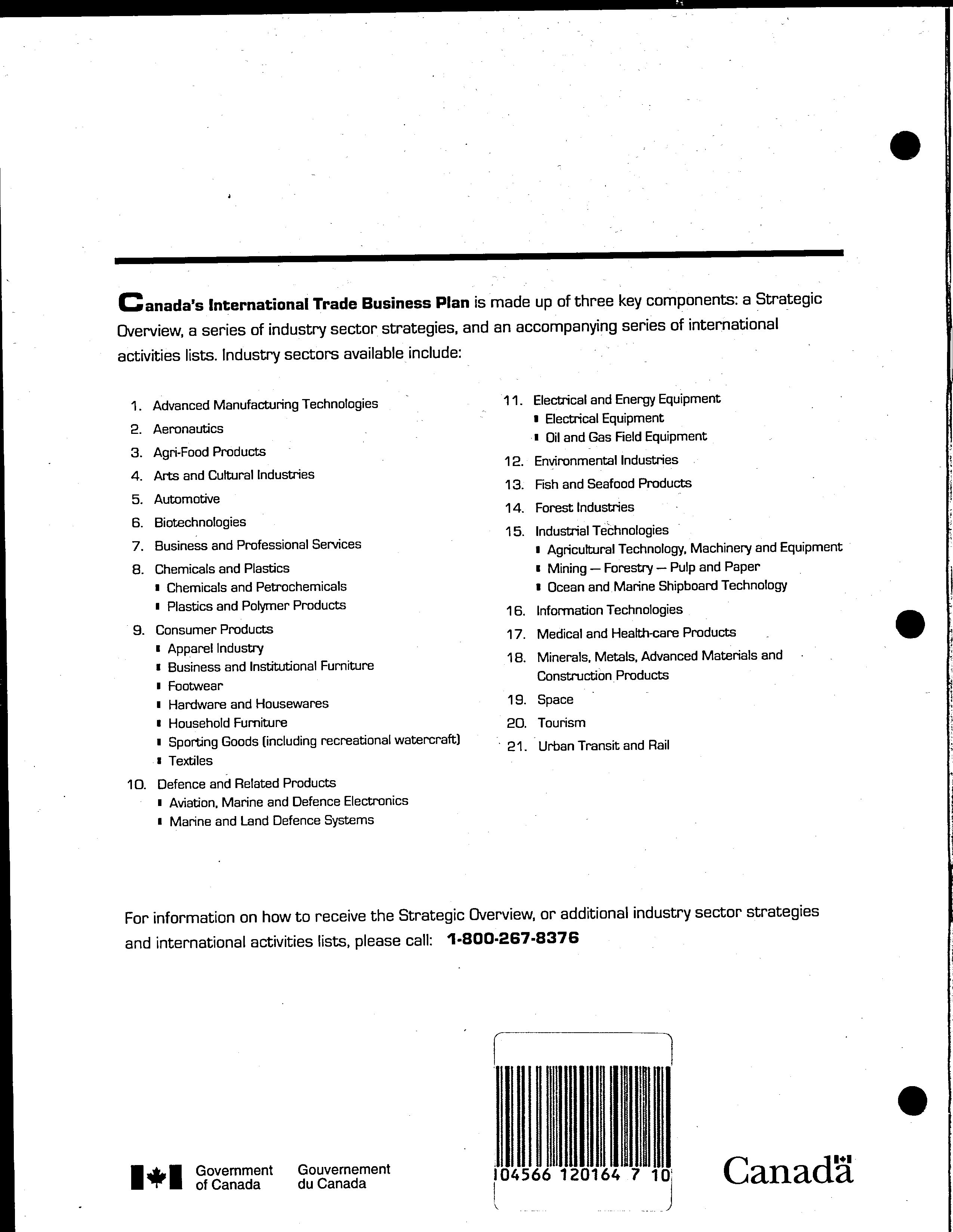 Canada's international trade business plan : an integrated plan for trade, investment and technology promotion and development. 1994/95