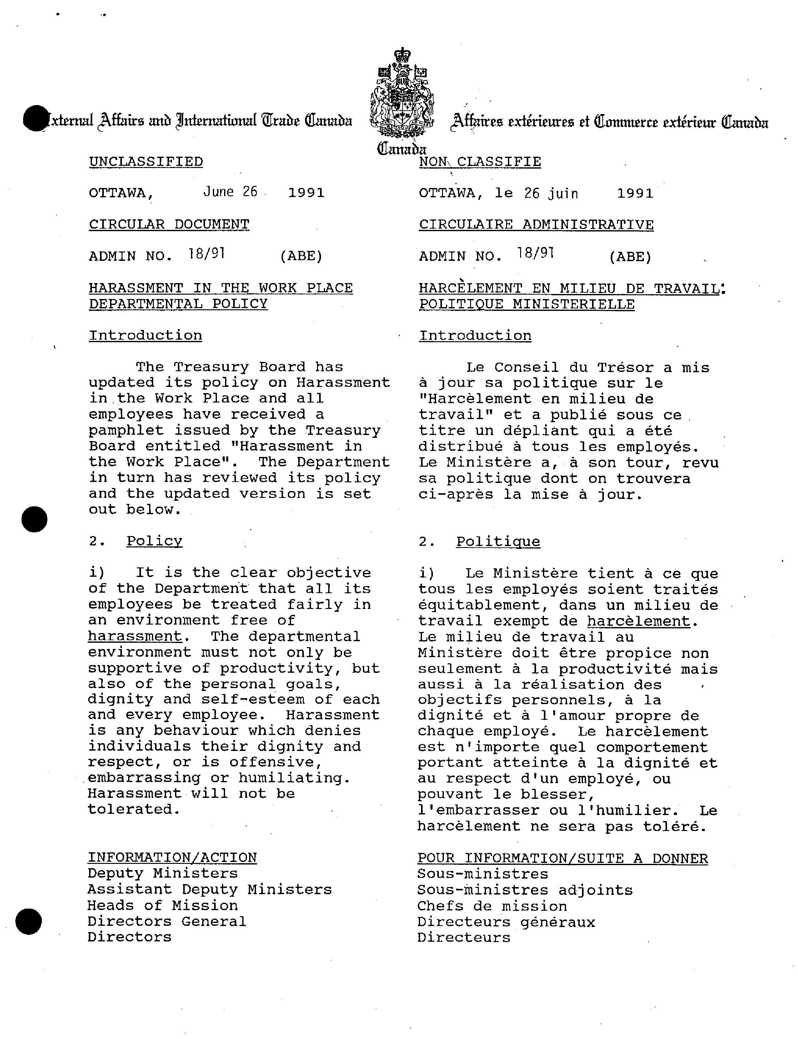 Circular document = Circulaire administrative / External Affairs and International Trade Canada. Dec. 16, 1991
