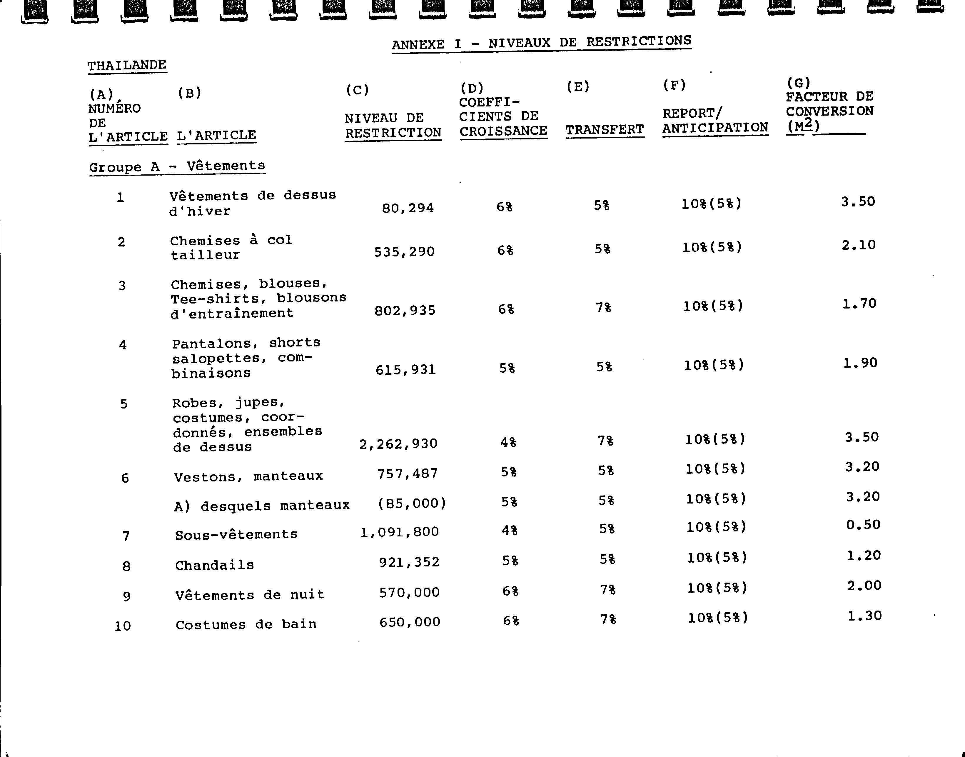 Sommaire des ententes bilatérales du Canada prévoyant des restrictions sur les importations : textiles et vêtements.