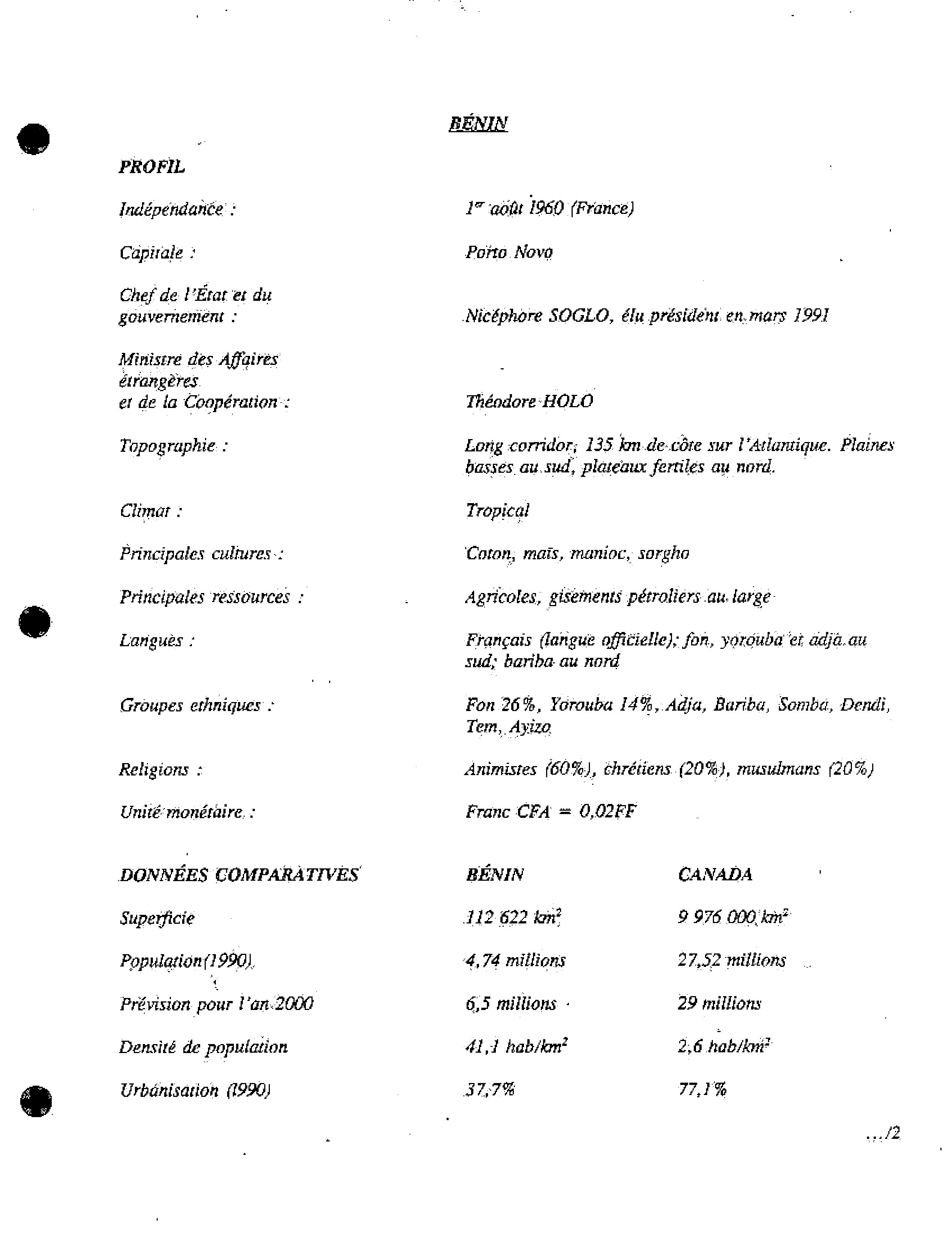 - Visite de l'Honorable Monique Vézina Ministre des relations extérieures et du développement international et Ministre d'État pour le troisième âge au Bénin, Ghana, Niger, Mali et en France : mai 1993.