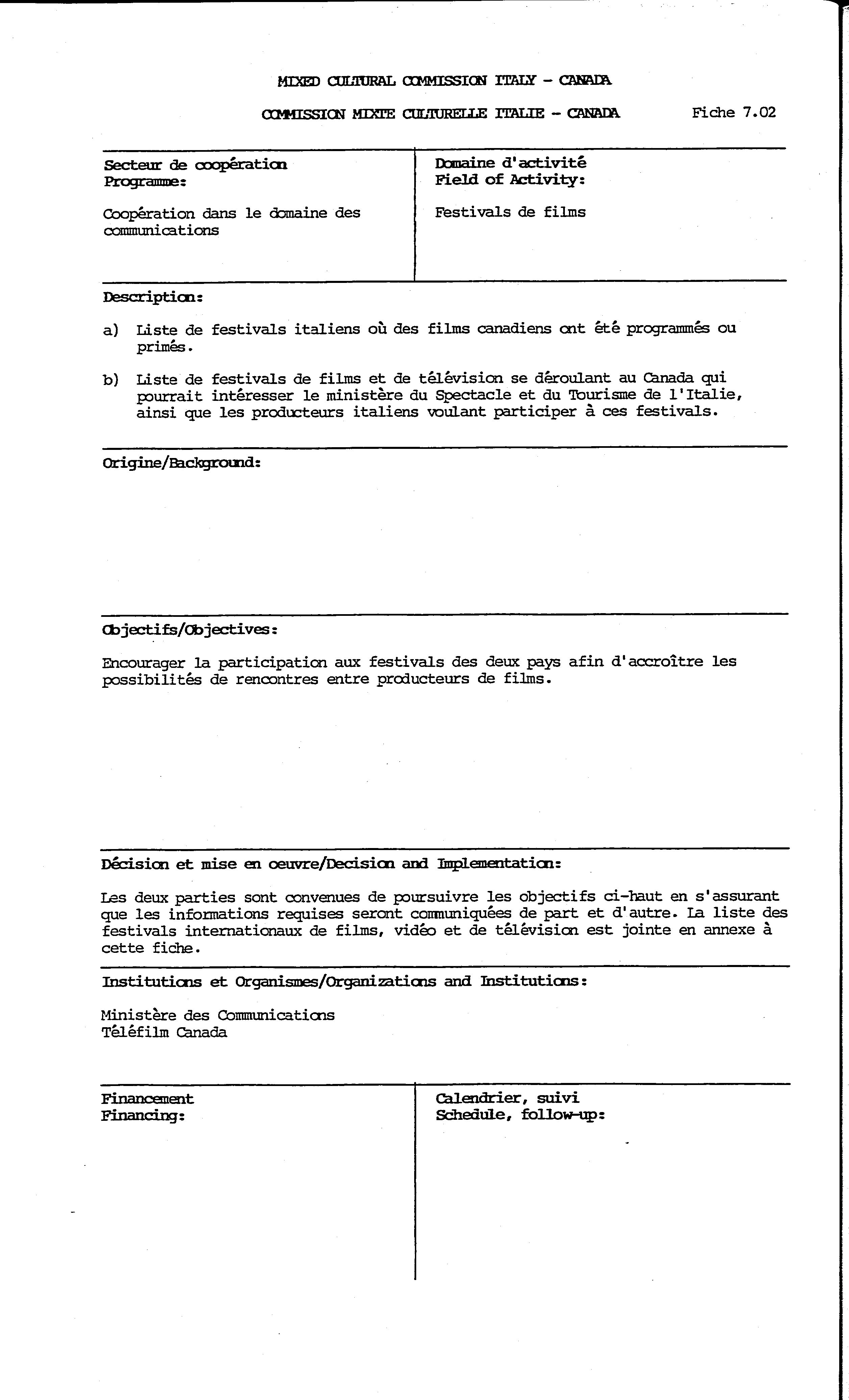 Commission mixte culturelle Italie - Canada (2ème : 1987 : Ottawa, Ontario)