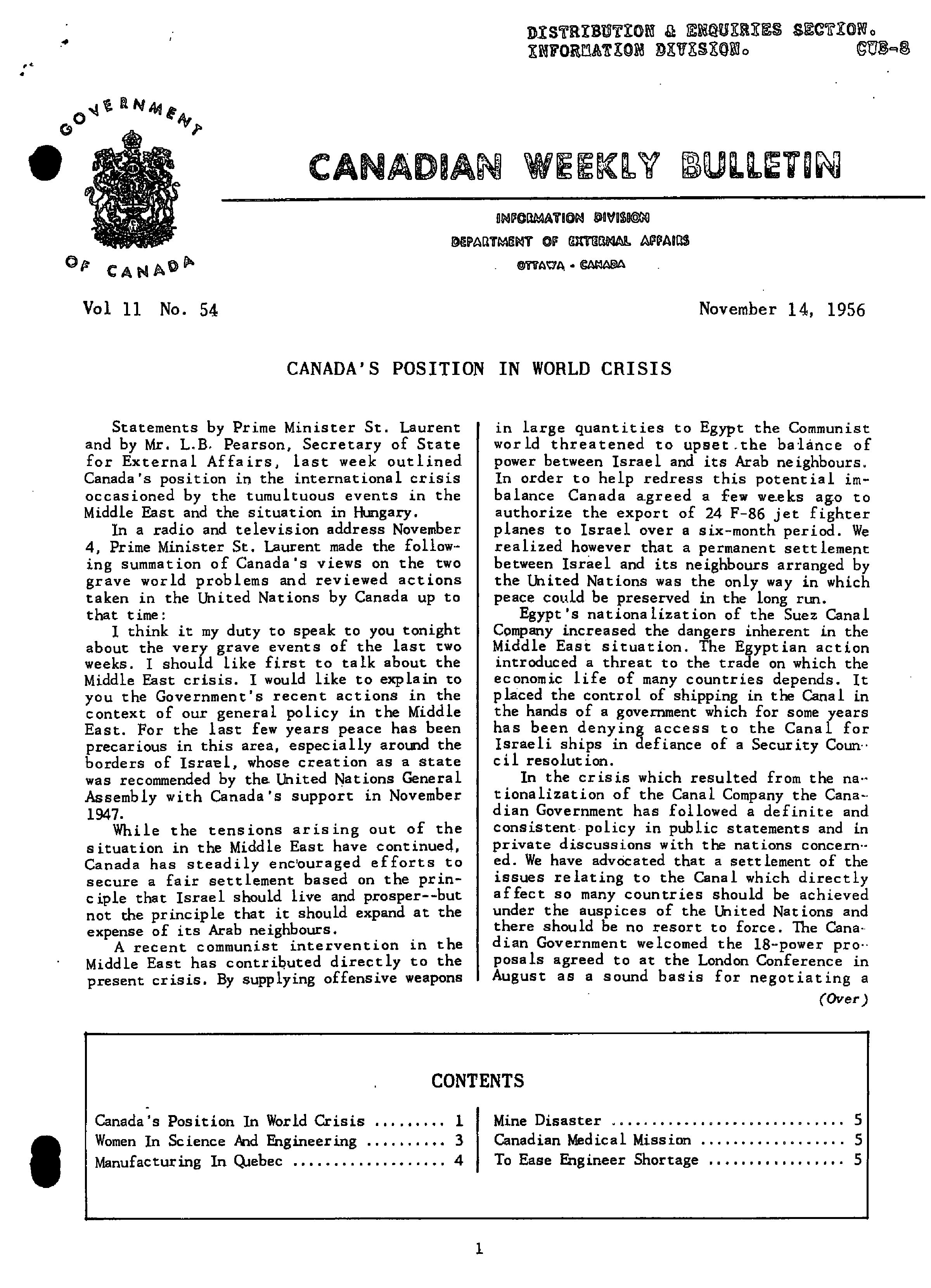 Canadian weekly bulletin / Information Division Department of External Affairs. Vol. 10, no. 10 (Jan. 7, 1955)-Vol. 11, no. 60 (Dec. 26, 1956)