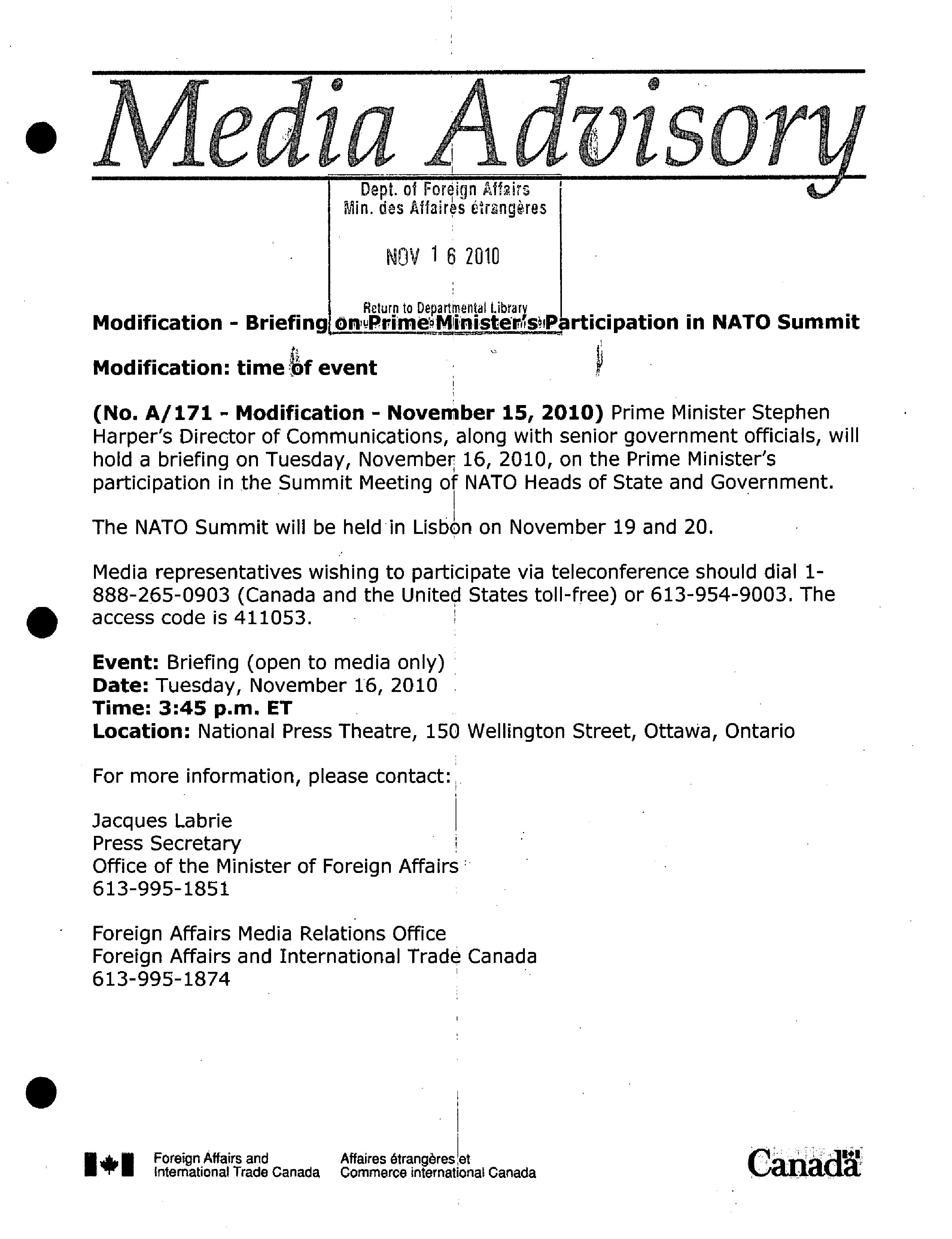 Media advisory / Department of Foreign Affairs and International Trade. 2010
