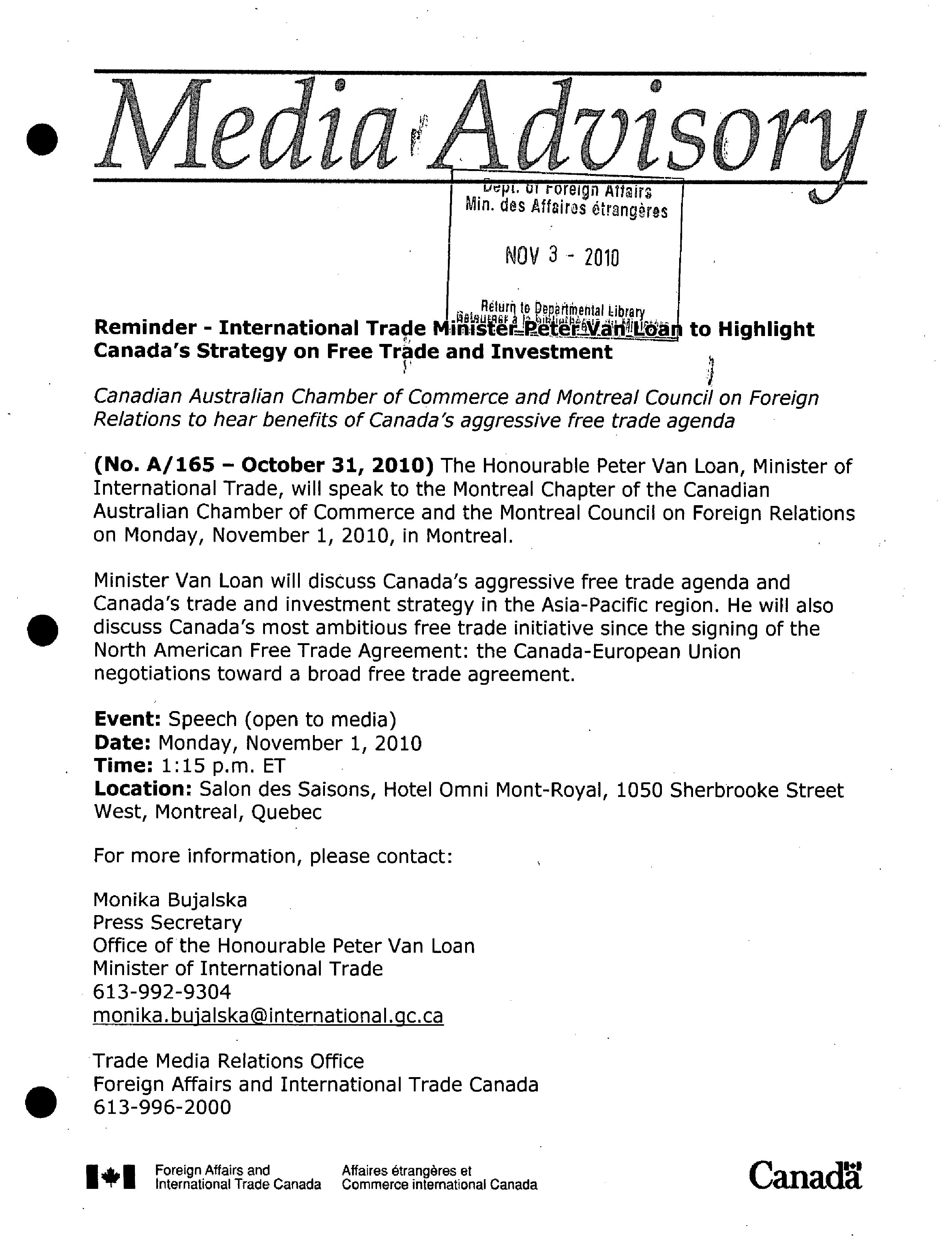 Media advisory / Department of Foreign Affairs and International Trade. 2010