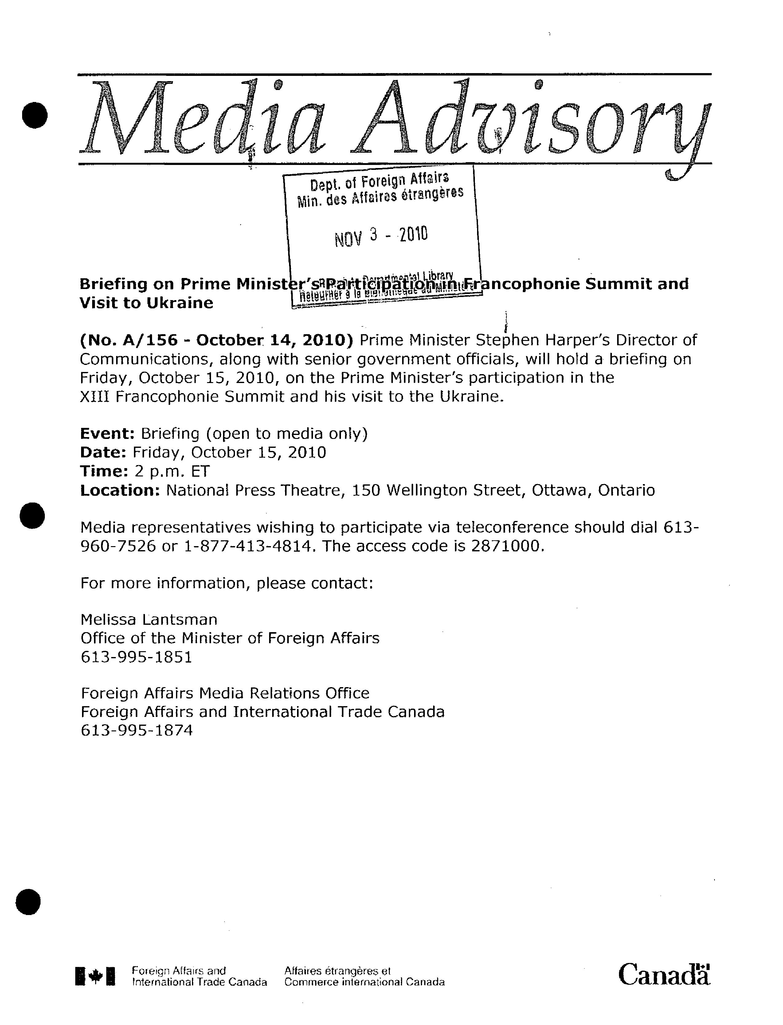 Media advisory / Department of Foreign Affairs and International Trade. 2010