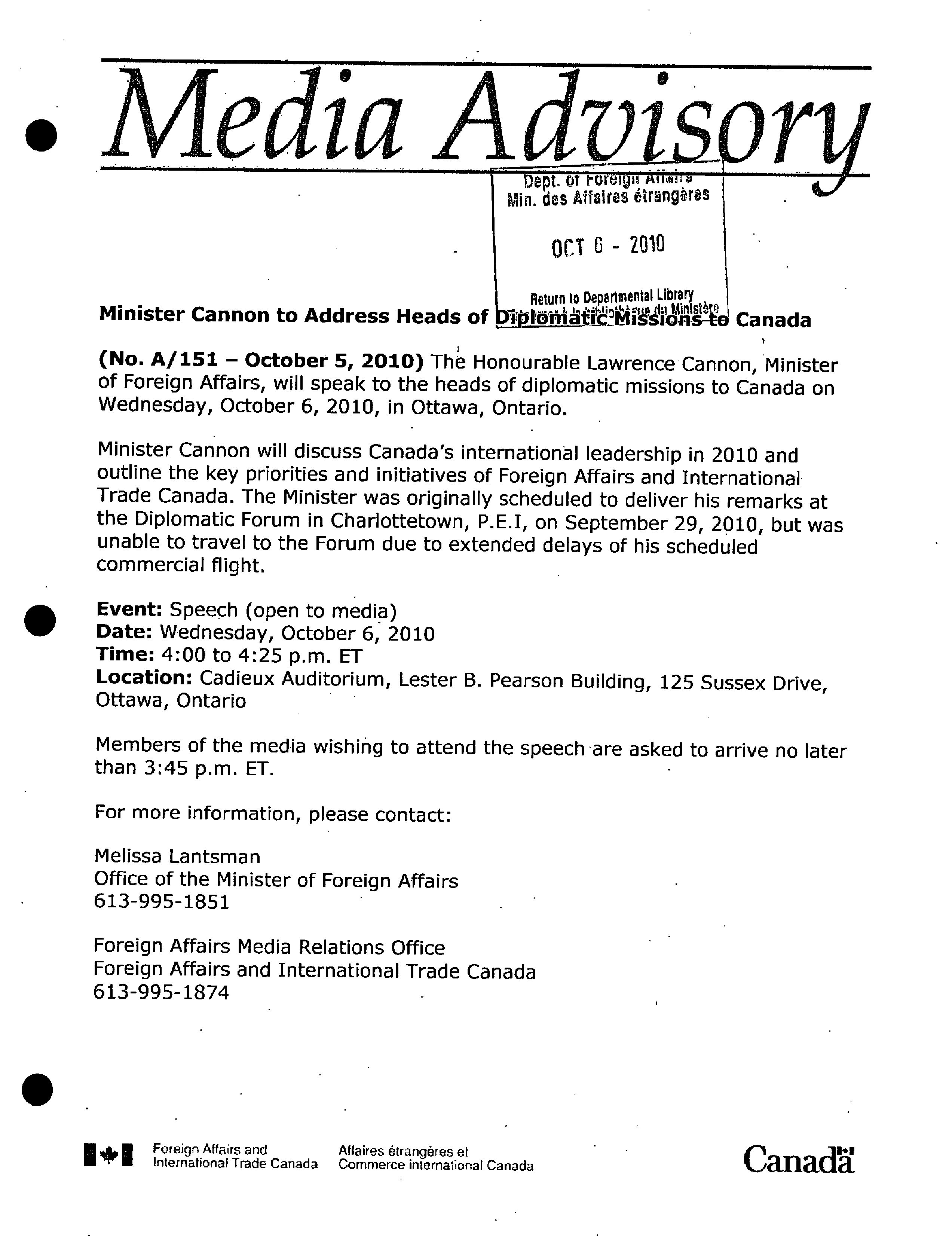 Media advisory / Department of Foreign Affairs and International Trade. 2010