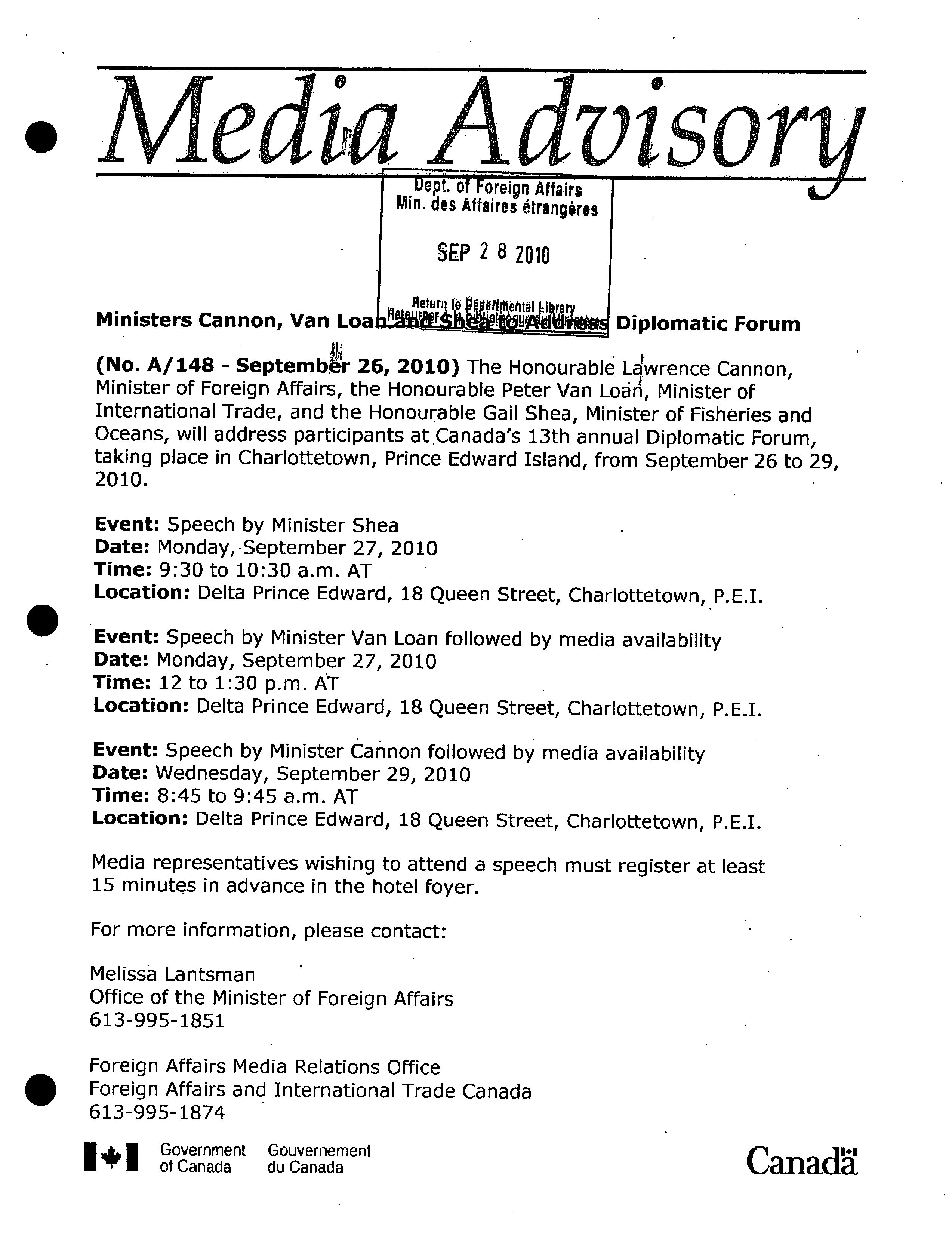 Media advisory / Department of Foreign Affairs and International Trade. 2010