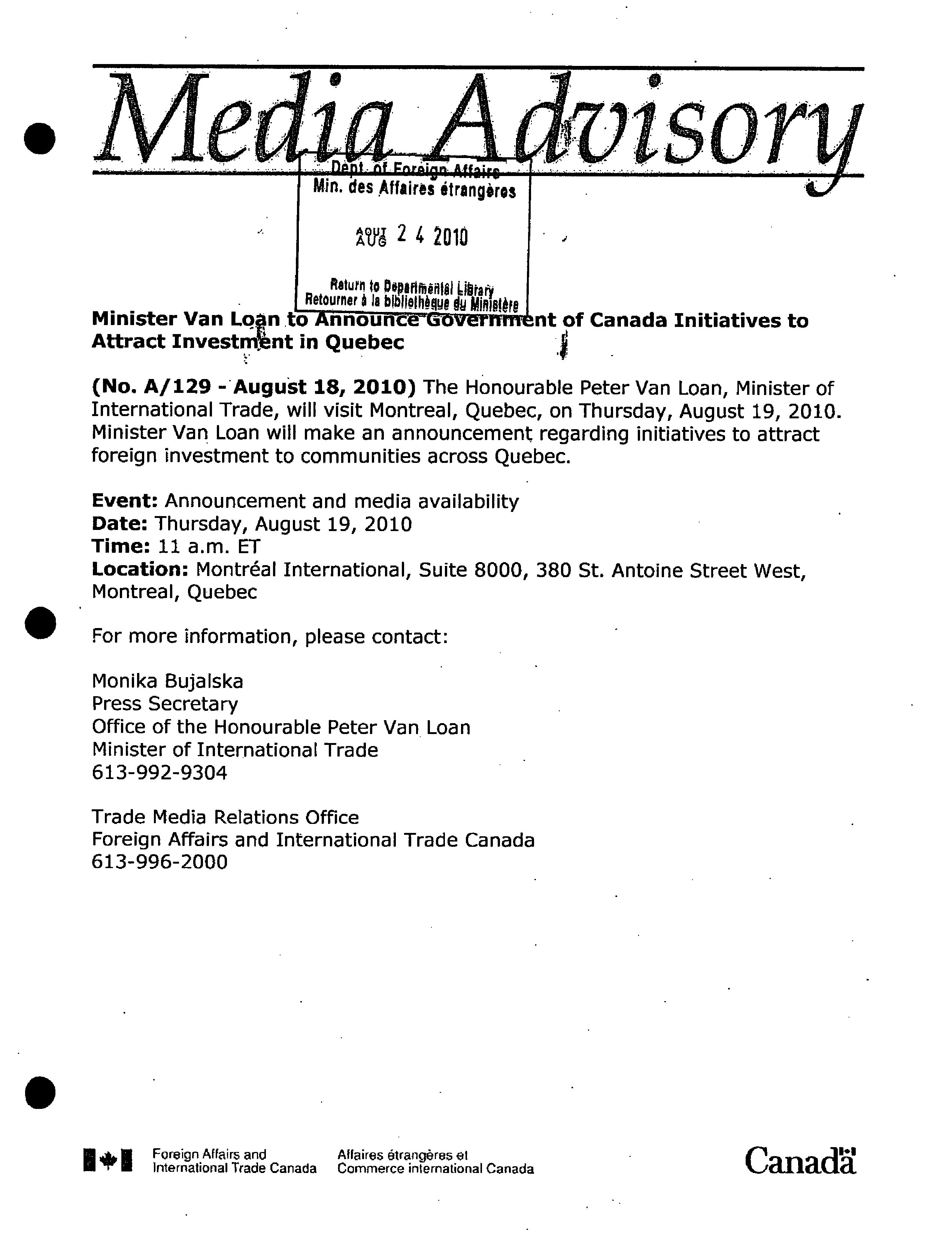 Media advisory / Department of Foreign Affairs and International Trade. 2010