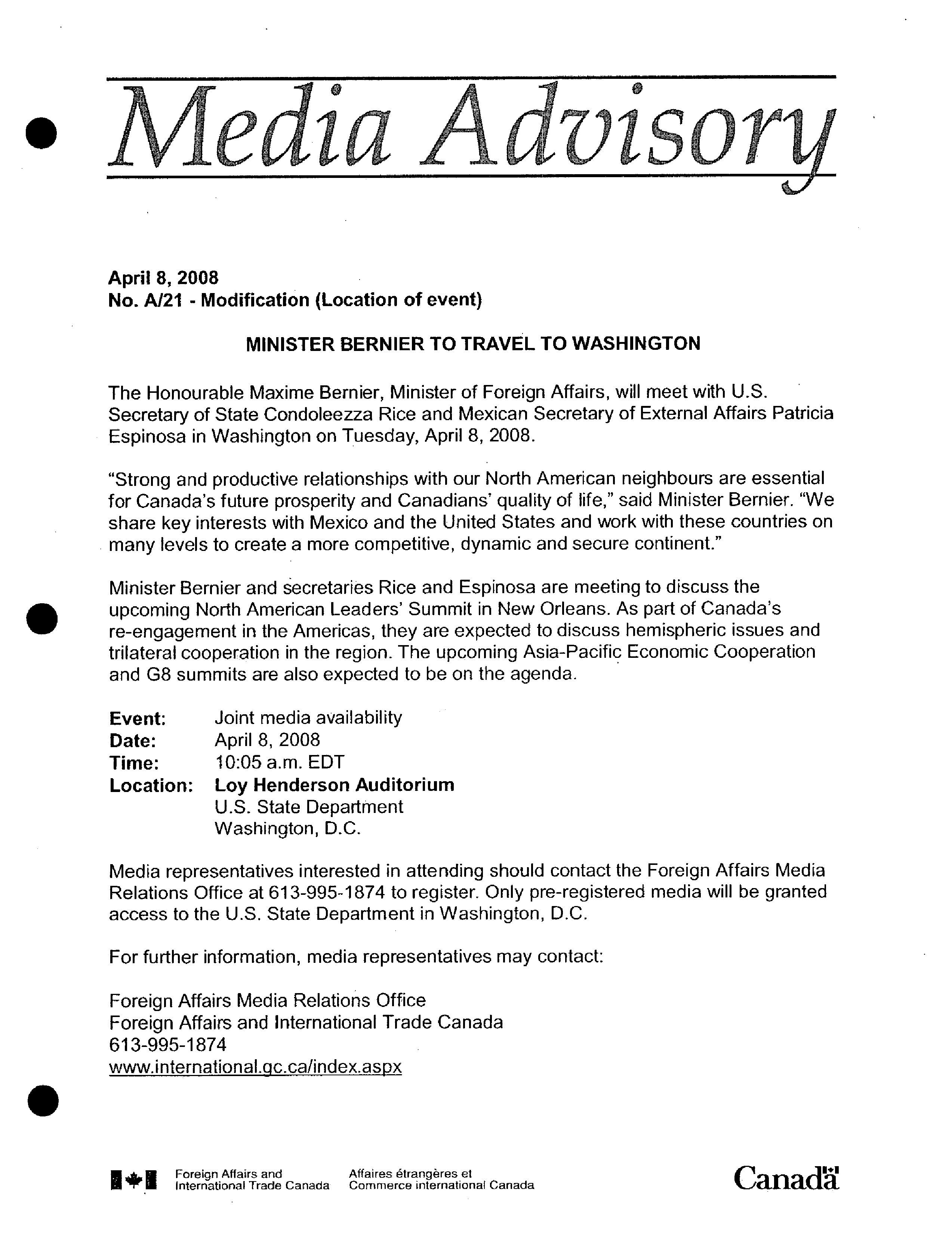 Media advisory / Department of Foreign Affairs and International Trade. No. A/76 (Dec. 17, 2008)