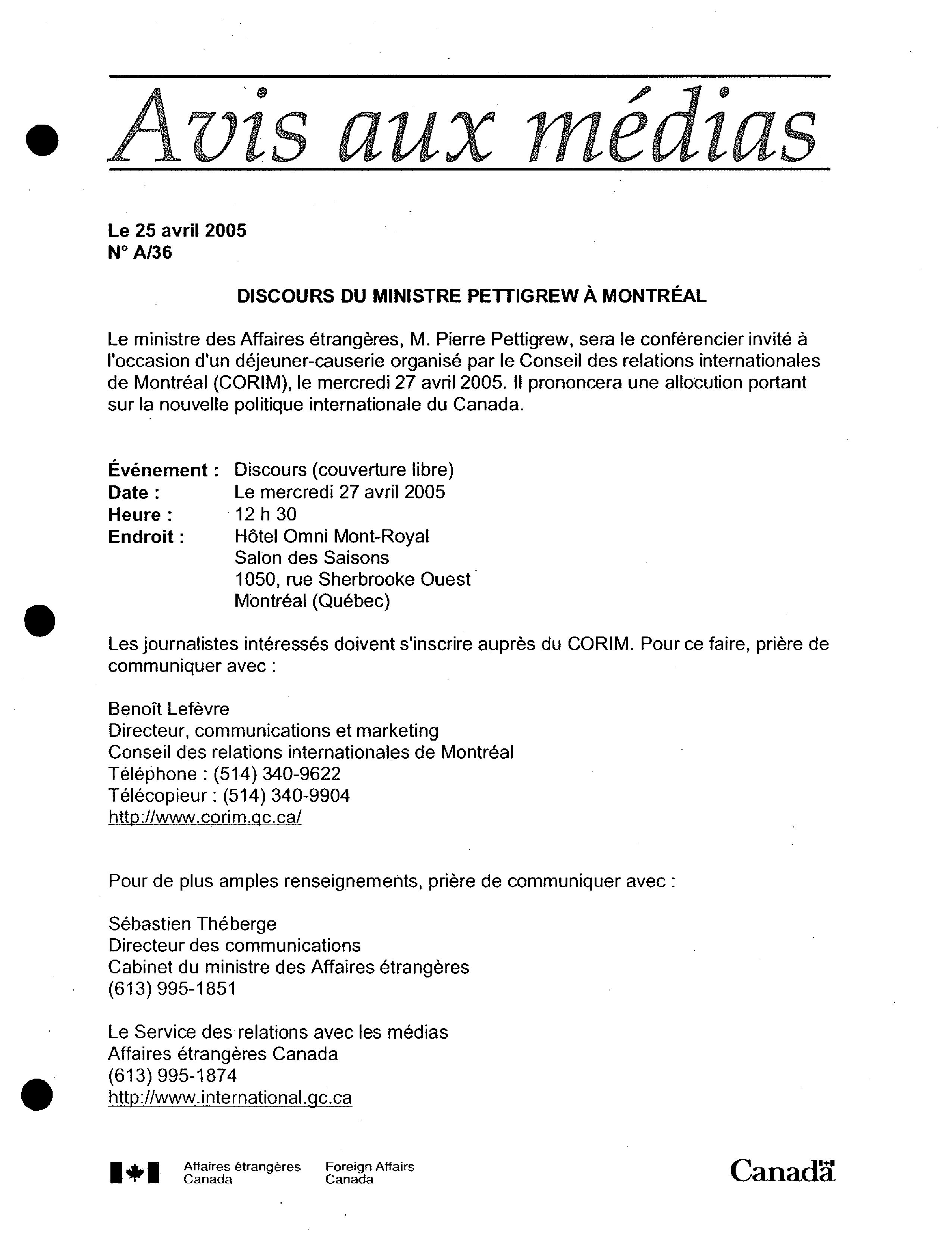 Avis aux médias / Ministère des affaires étrangères et du commerce international. 2005