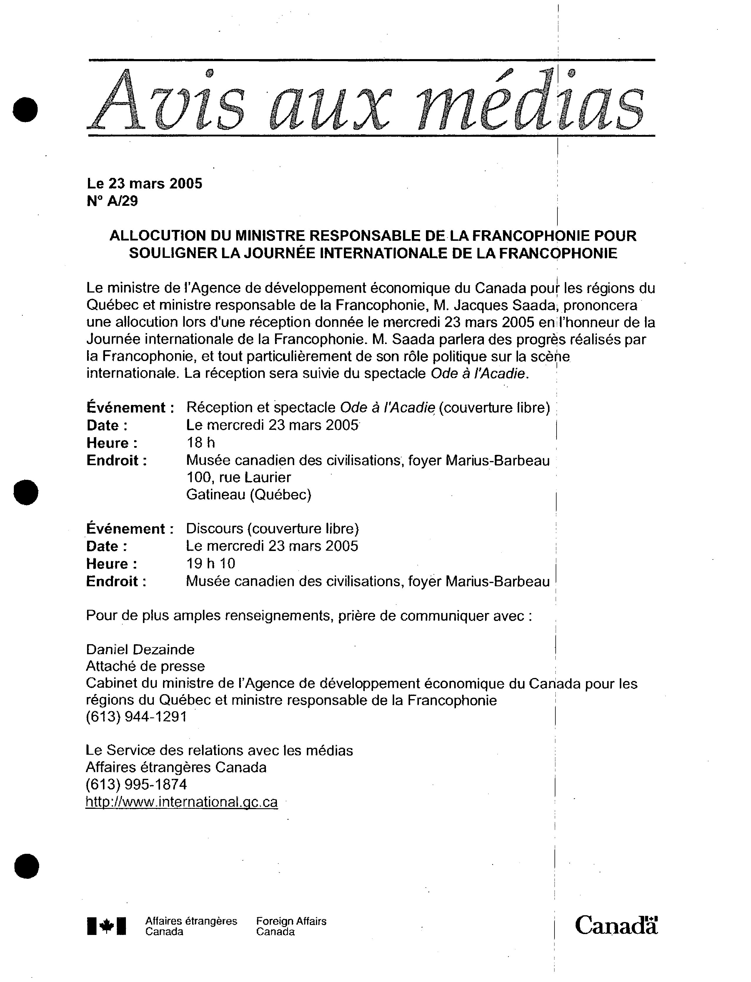 Avis aux médias / Ministère des affaires étrangères et du commerce international. 2005