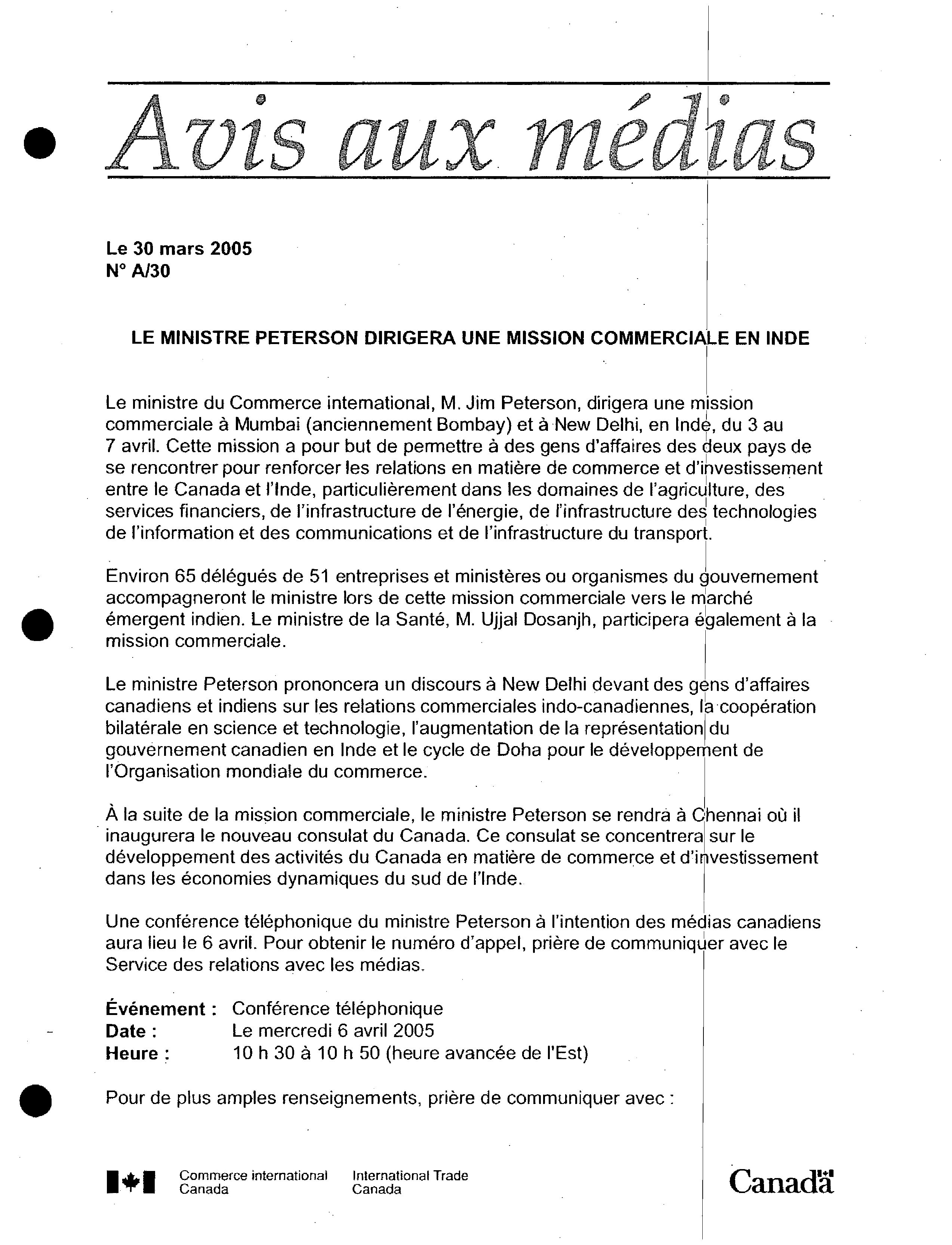 Avis aux médias / Ministère des affaires étrangères et du commerce international. 2005