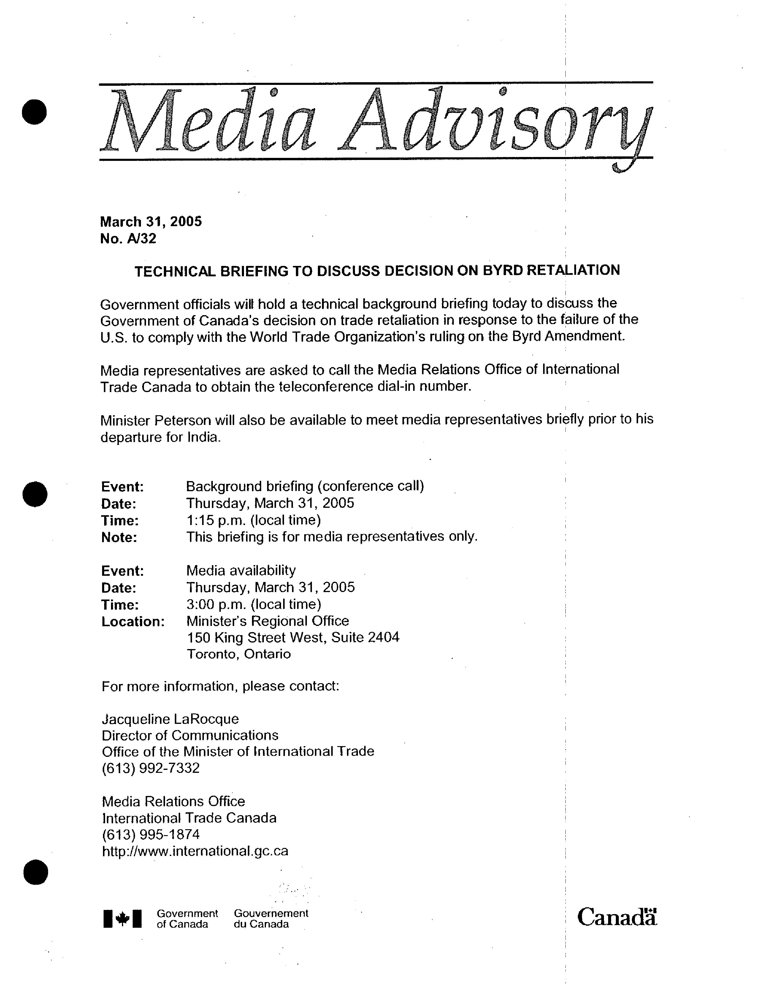Avis aux médias / Ministère des affaires étrangères et du commerce international. 2005