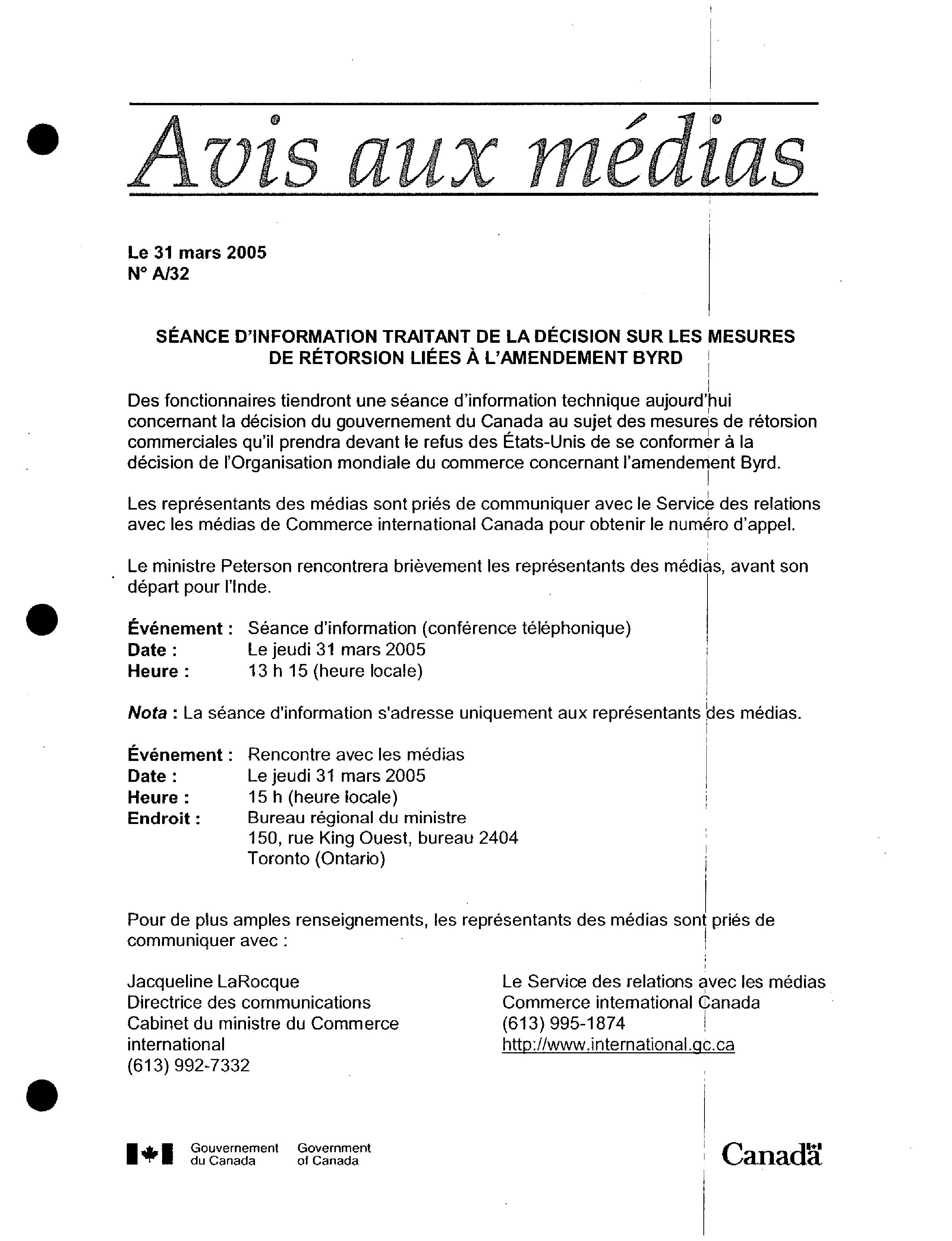 Avis aux médias / Ministère des affaires étrangères et du commerce international. 2005