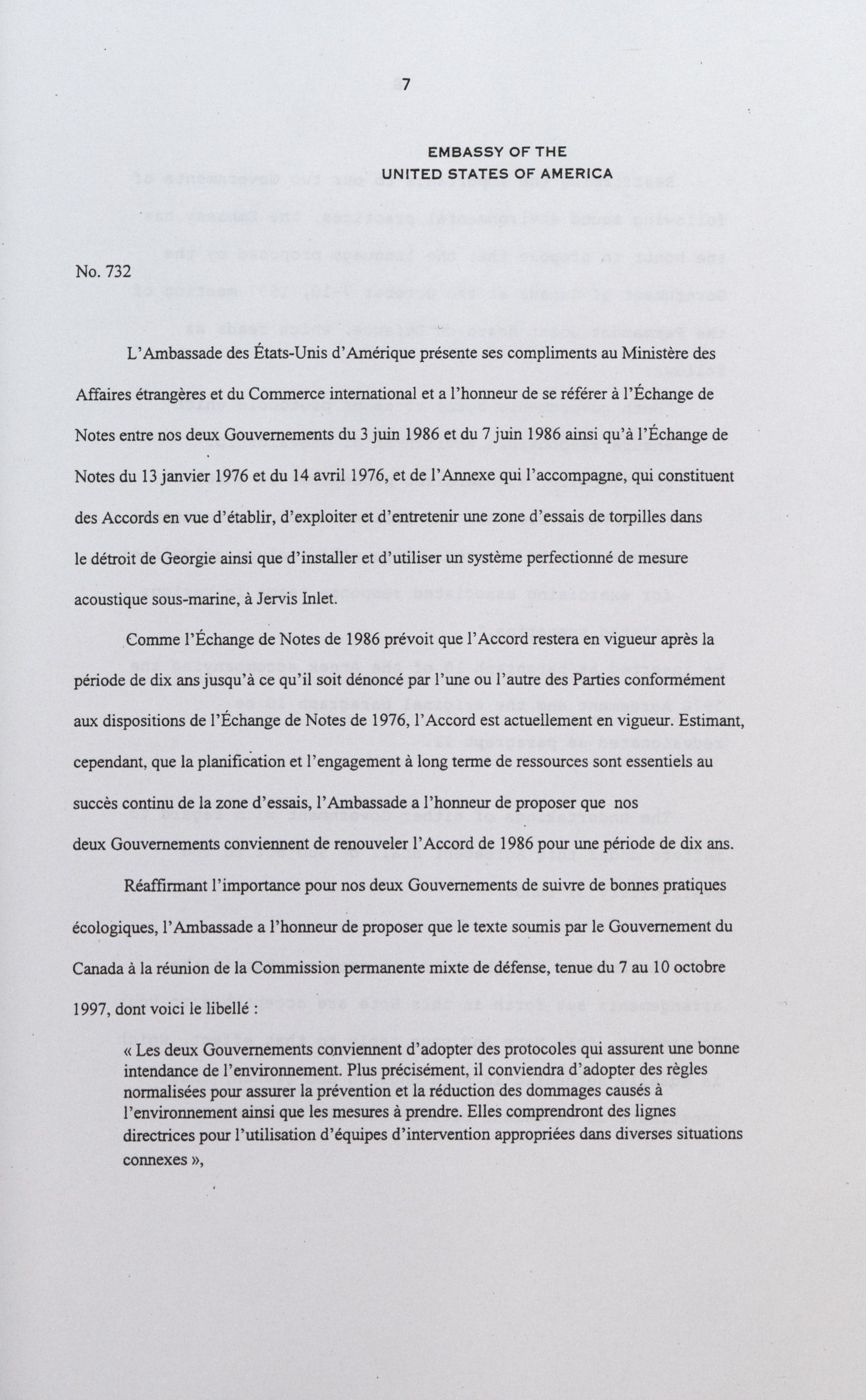 Défence : échange de notes constituant un accord entre le gouvernement du Canada le gouvernement des États-Unis d'Amérique en vue de prolonger pour dix ans la validité de l'accord du 17 juin 1986 prévoyant la poursuite de l'exploitation et de l'entretien de la zone d'essais de torpilles dans le détroit de Georgie et visant à modifier l'annexe jointe à l'échange de notes du 13 janvier et du 14 avril 1976.