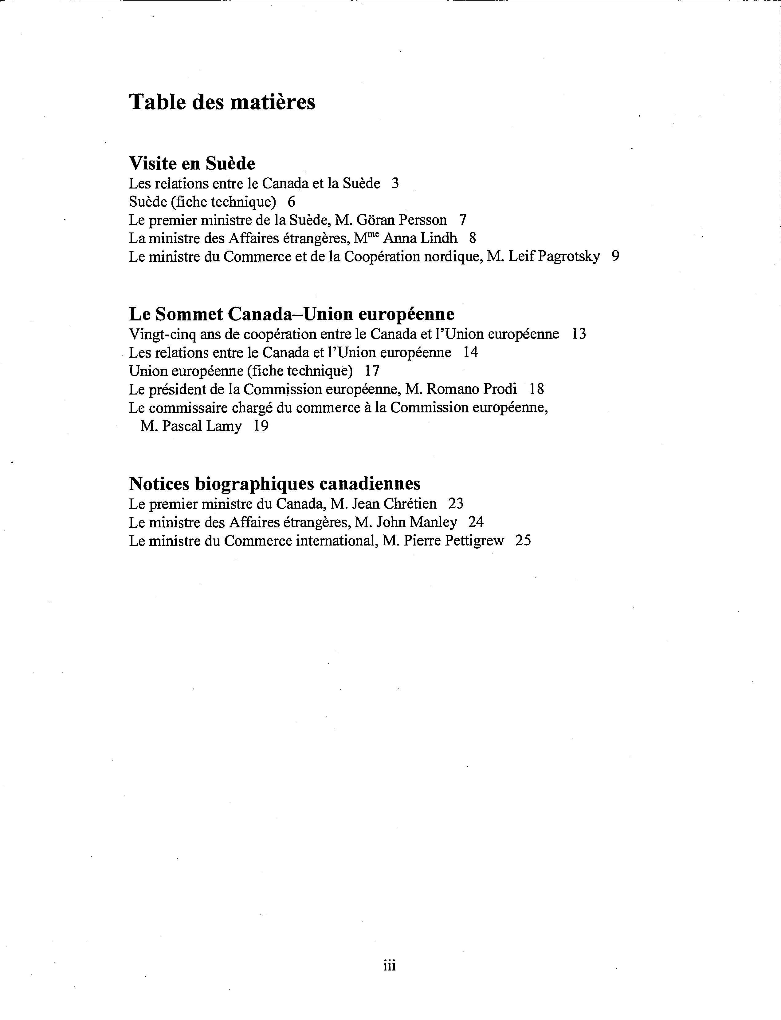 Visit to Sweden by Prime Minister Jean Chrétien June 20-22, 2001 and Canada-European Union Summit June 21, 2001 Stockholm : background information. - Adresse bibliographique