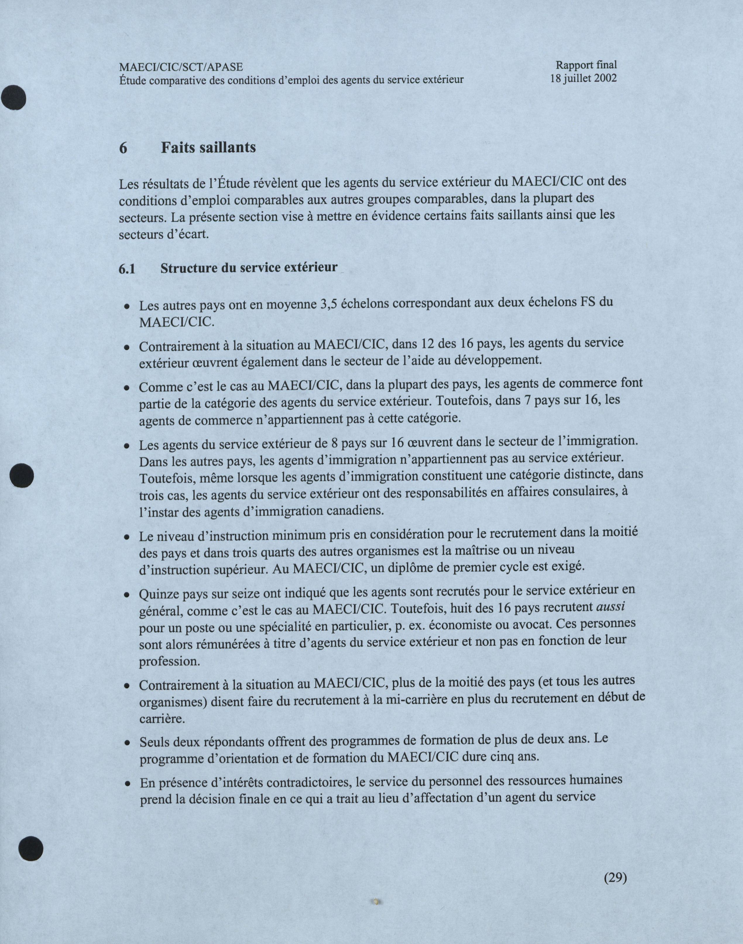 Étude comparative des conditions d'emploi des agents du service extérieur.