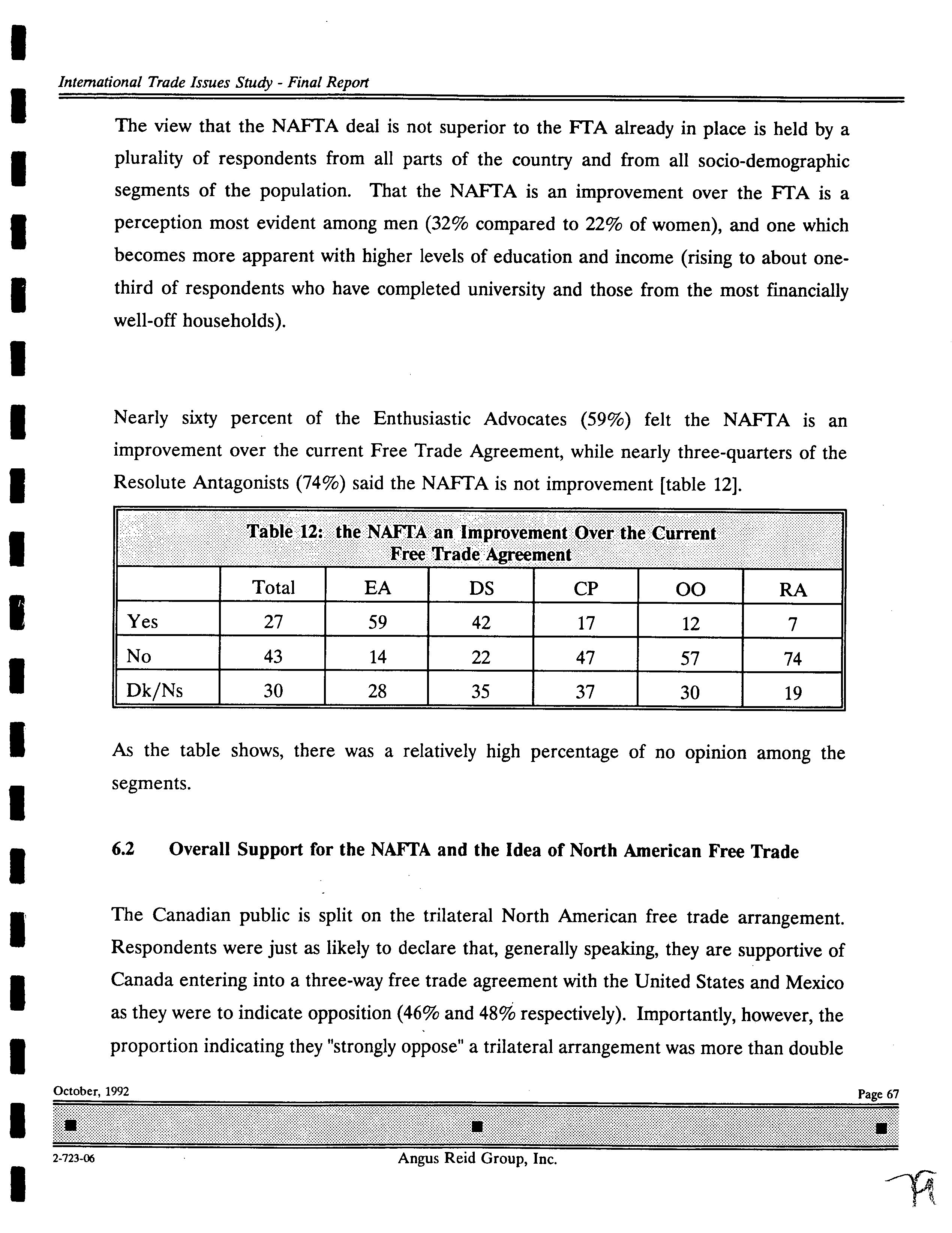 Canadian public opinion on international trade issues : final report on research findings / submitted to External Affairs ; submitted by Angus Reid Group, Inc. Vol. 1 (Oct. 1992)