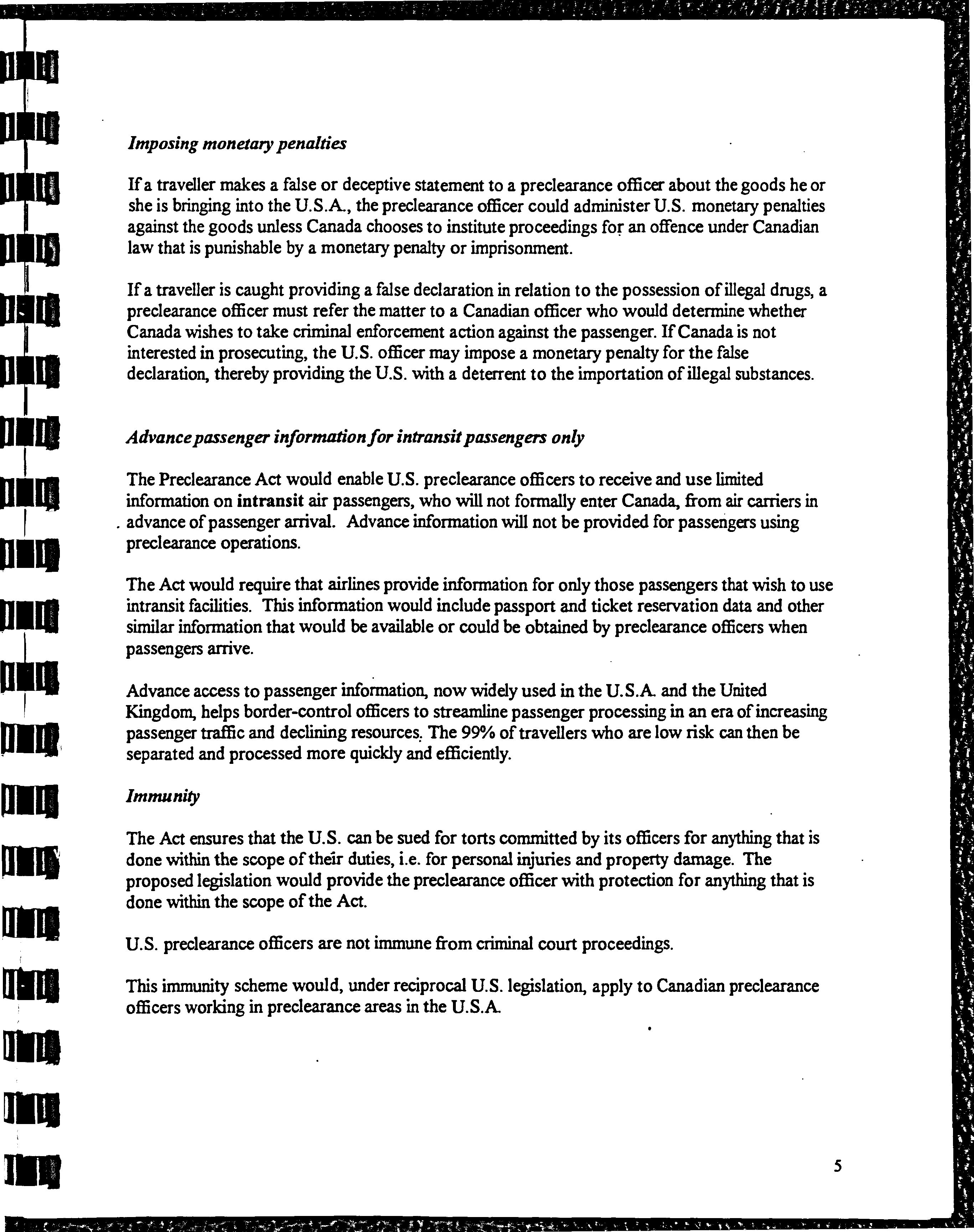 News release December 1, 1998: The United States and Canada announce intransit preclearance initiative -- News release no. 276, December 1, 1998: Canada-U.S. agreement leads to introduction of legislation for improved customs services -- Preclearance and intransit preclearance : backgrounder -- The Preclearance Act : overview of the legislation.
