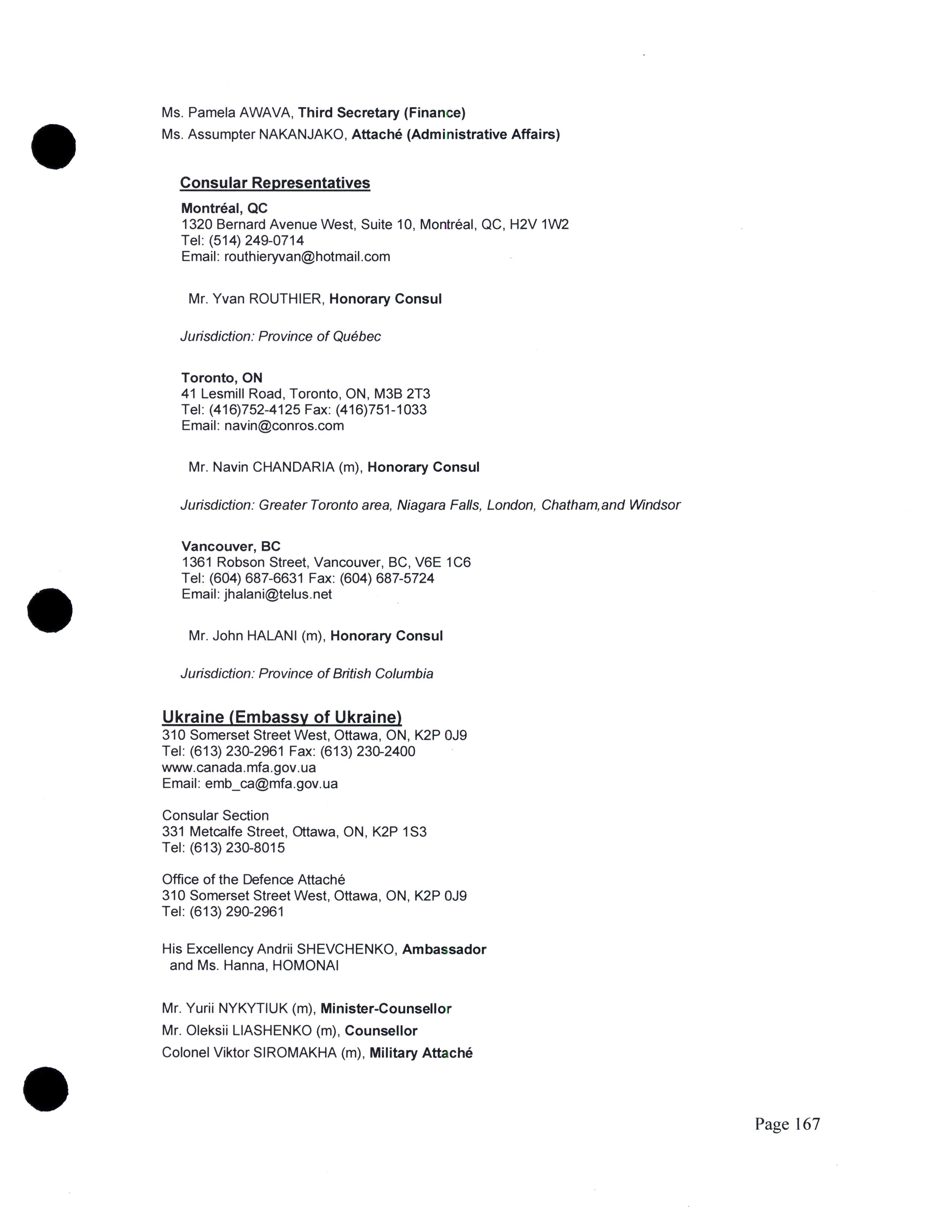 Diplomatic, consular, and other representatives in Canada.