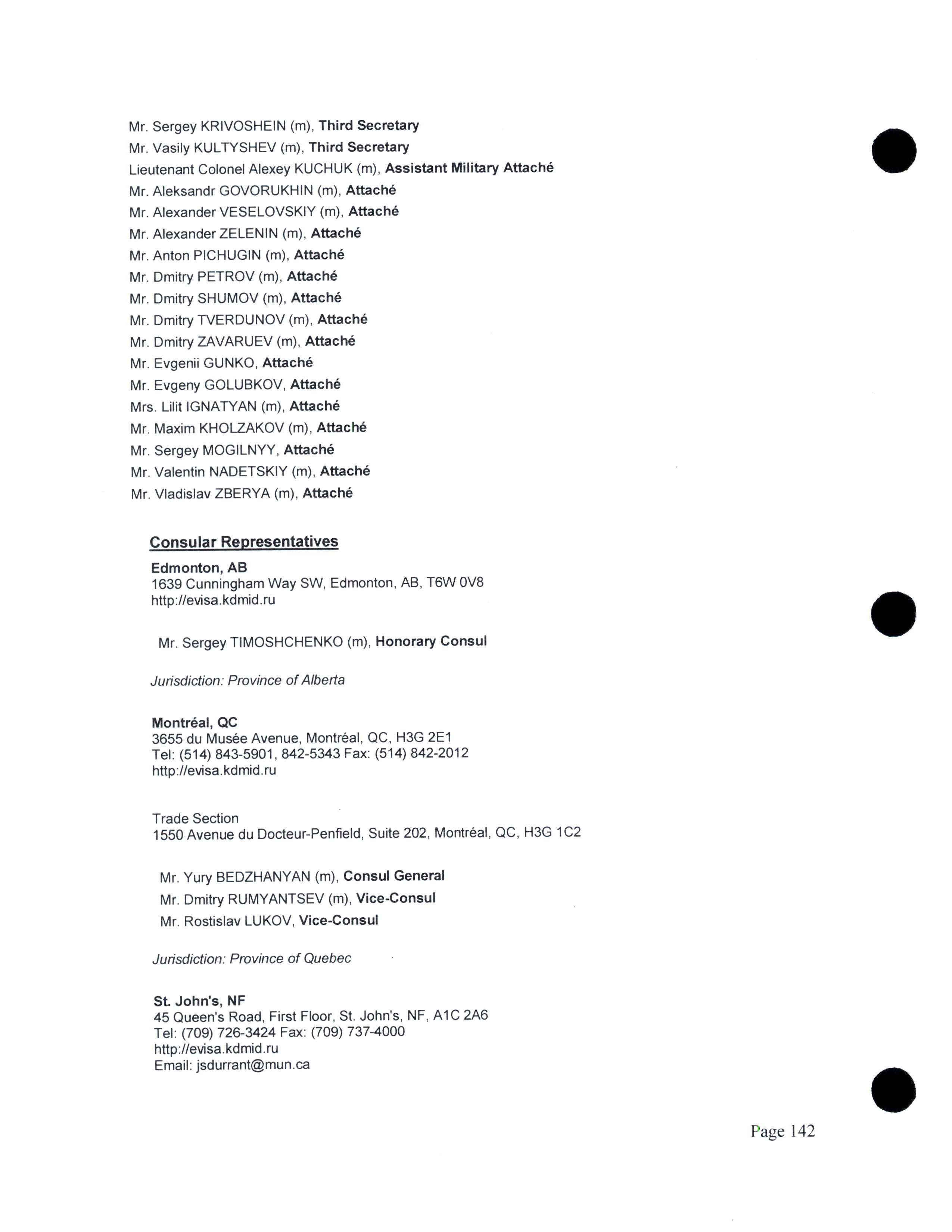 Diplomatic, consular, and other representatives in Canada.